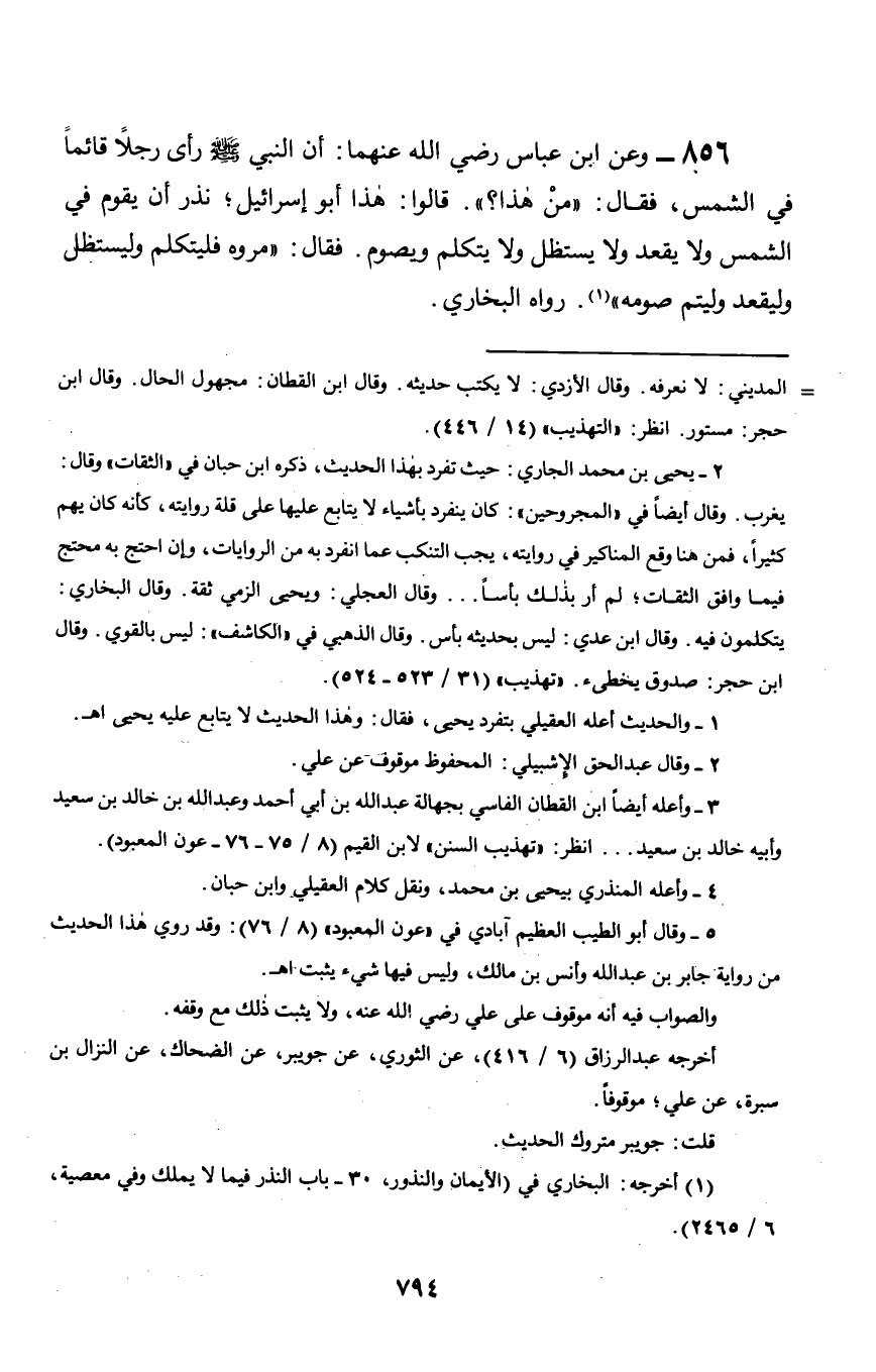 856 - وعن ابن عباس رضي الله عنهما: أن النبي صلى الله عليه وسلم رأى رجلاً قائماً في الشمس, فقال: «منْ هذا؟». قالوا: هذا أبو إسرائيل؛ نذر أن يقوم في الشمس ولا يقعد ولا يستظل ولا يتكلم ويصوم. فقال: «مروه فليتكلم وليستظل وليقعد وليتم صومه». رواه البخاري.