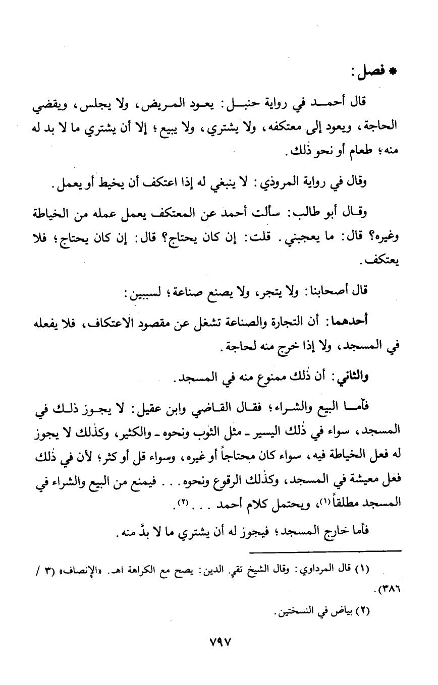 فأما البيع والشراء؛ فقال القاضي وابن عقيل: لا يجوز ذلك في المسجد, سواء في ذلك اليسير - مثل الثوب ونحوه - والكثير, وكذلك لا يجوز له فعل الخياطة فيه, سواء كان محتاجاً أو غيره, وسواء قل أو كثر؛ لأن في ذلك فعل معيشة في المسجد, وكذلك الرقوع ونحوه. . . فيمنع من البيع والشراء في المسجد مطلقاً, ويحتمل كلام أحمد. . . .