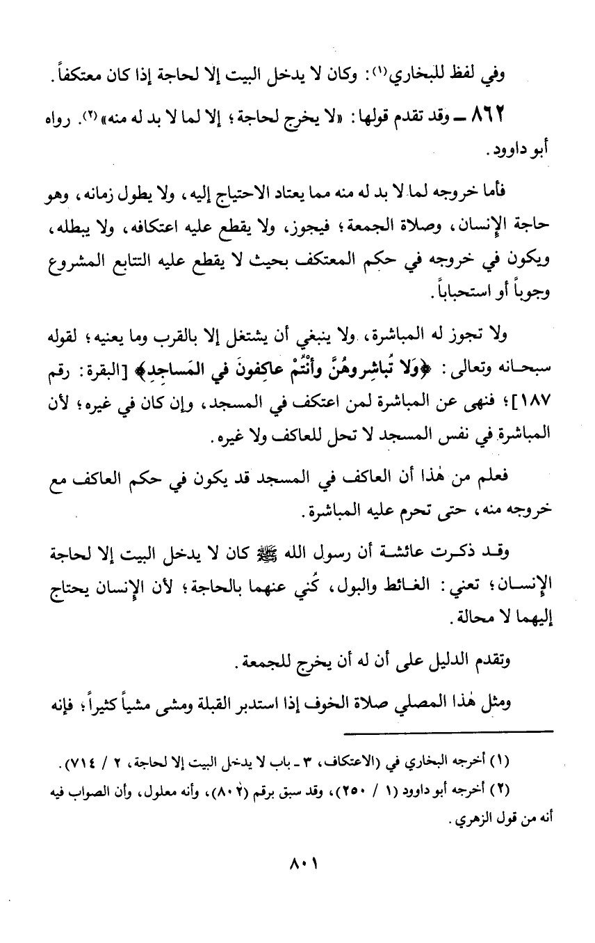 862 - وقد تقدم قولها: «لا يخرج لحاجة؛ إلا لما لا بد له منه». رواه أبو داوود.