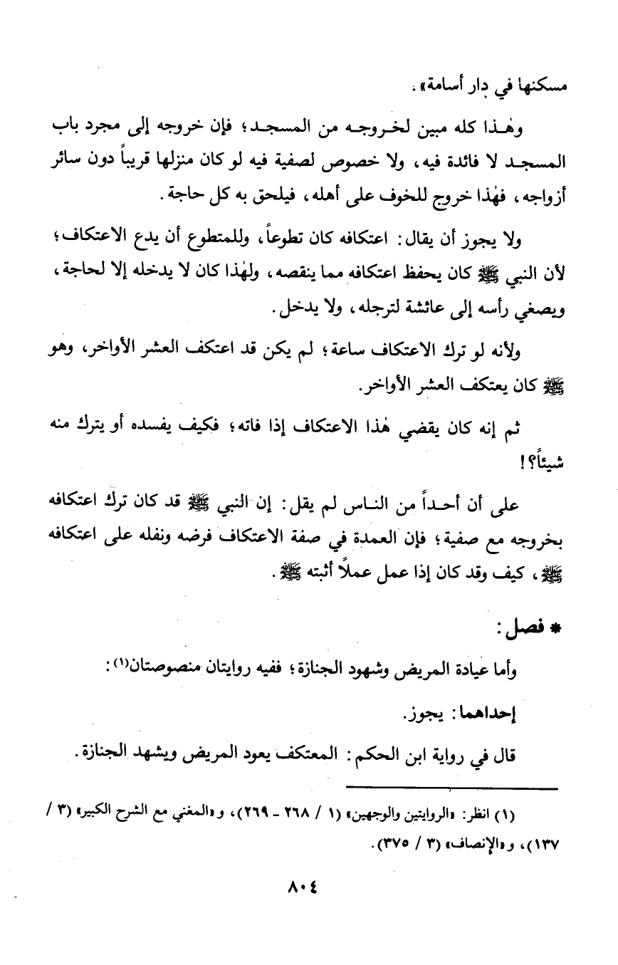 على أن أحداً من الناس لم يقل: إن النبي صلى الله عليه وسلم قد كان ترك اعتكافه بخروجه مع صفية؛ فإن العمدة في صفة الاعتكاف فرضه ونفله على اعتكافه صلى الله عليه وسلم, كيف وقد كان إذا عمل عملاً أثبته صلى الله عليه وسلم.