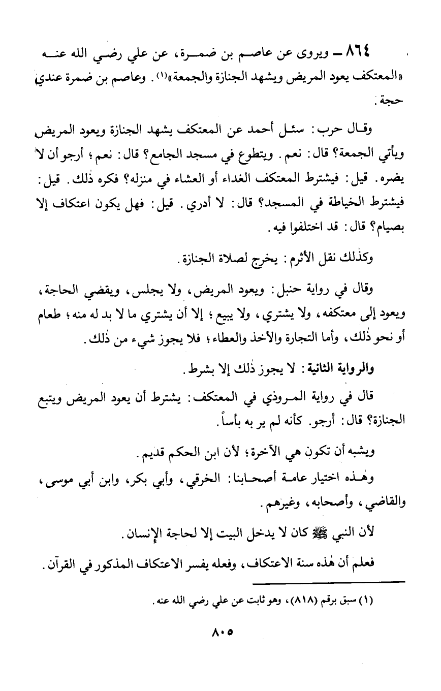 864 - ويروى عن عاصم بن ضمرة, عن علي رضي الله عنه «المعتكف يعود المريض ويشهد الجنازة والجمعة». وعاصم بن ضمرة عندي حجة.