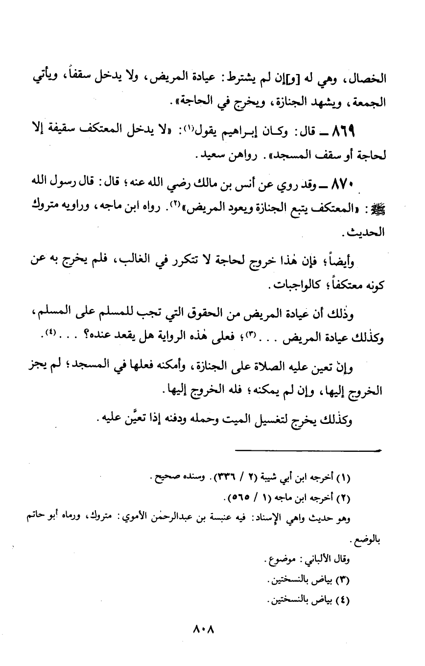 870 - وقد روي عن أنس بن مالك رضي الله عنه؛ قال: قال رسول الله صلى الله عليه وسلم: «المعتكف يتبع الجنازة ويعود المريض». رواه ابن ماجه, وراويه متروك الحديث.