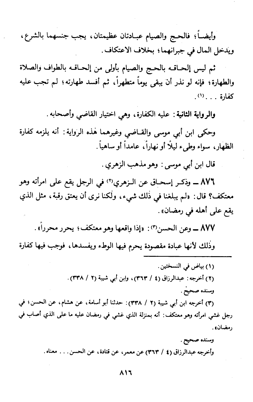 877 - وعن الحسن: «إذا واقعها وهو معتكف؛ يحرر محرراً».