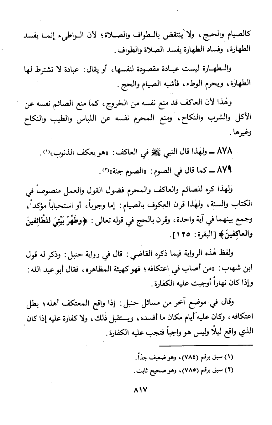 ولهذا كره للصائم والعاكف والمحرم فضول القول والعمل منصوصاً في الكتاب والسنة, ولهذا قرن العكوف بالصيام: إما وجوباً, أو استحباباً مؤكداً, وجمع بينهما في آية واحدة, وقرن بالحج في قوله تعالى: {طَهِّرَا بَيْتِيَ لِلطَّائِفِينَ وَالْعَاكِفِينَ} [البقرة: 125].