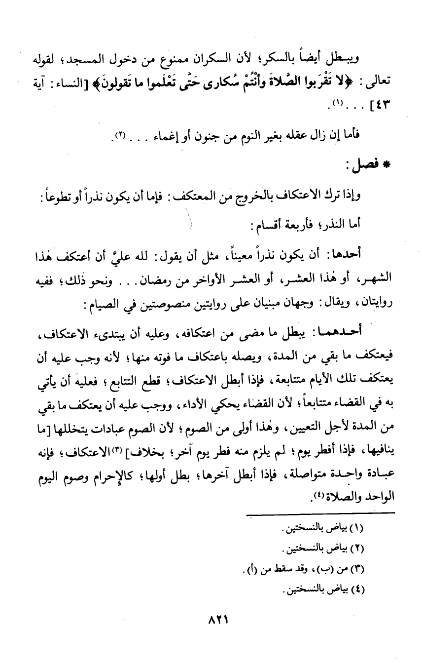 ويبطل أيضاً بالسكر؛ لأن السكران ممنوع من دخول المسجد؛ لقوله تعالى: {لَا تَقْرَبُوا الصَّلَاةَ وَأَنْتُمْ سُكَارَى حَتَّى تَعْلَمُوا مَا تَقُولُونَ} [النساء: آية 43]. . . .
