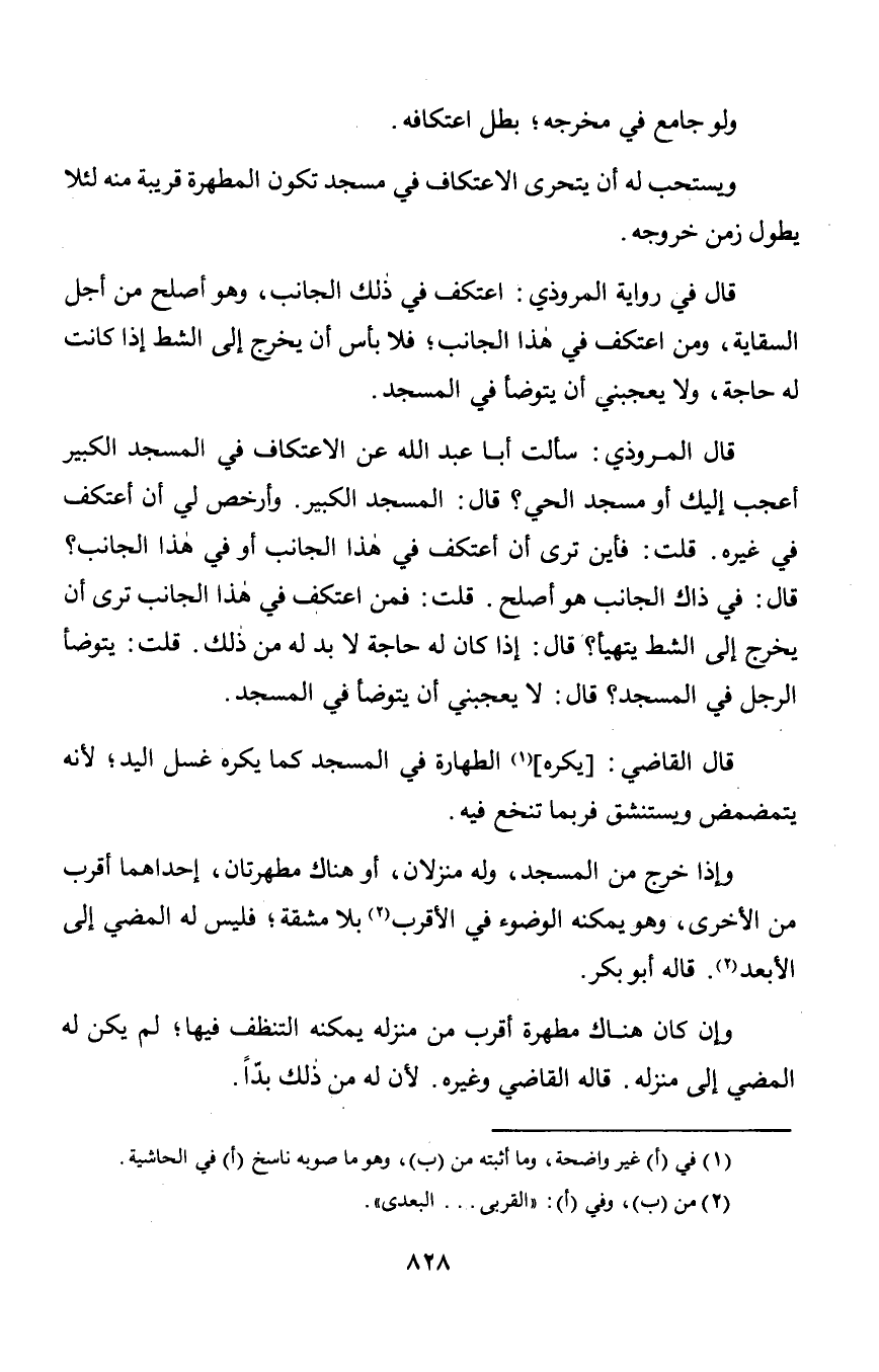 قال المروذي: سألت أبا عبد الله عن الاعتكاف في المسجد الكبير أعجب إليك أو مسجد الحي؟ قال: المسجد الكبير. وأرخص لي أن أعتكف في غيره. قلت: فأين ترى أن أعتكف في هذا الجانب أو في هذا الجانب؟ قال: في ذاك الجانب هو أصلح. قلت: فمن اعتكف في هذا الجانب ترى أن يخرج إلى الشط يتهيأ؟ قال: إذا كان له حاجة لا بد له من ذلك. قلت: يتوضأ الرجل في المسجد؟ قال: لا يعجبني أن يتوضأ في المسجد.
