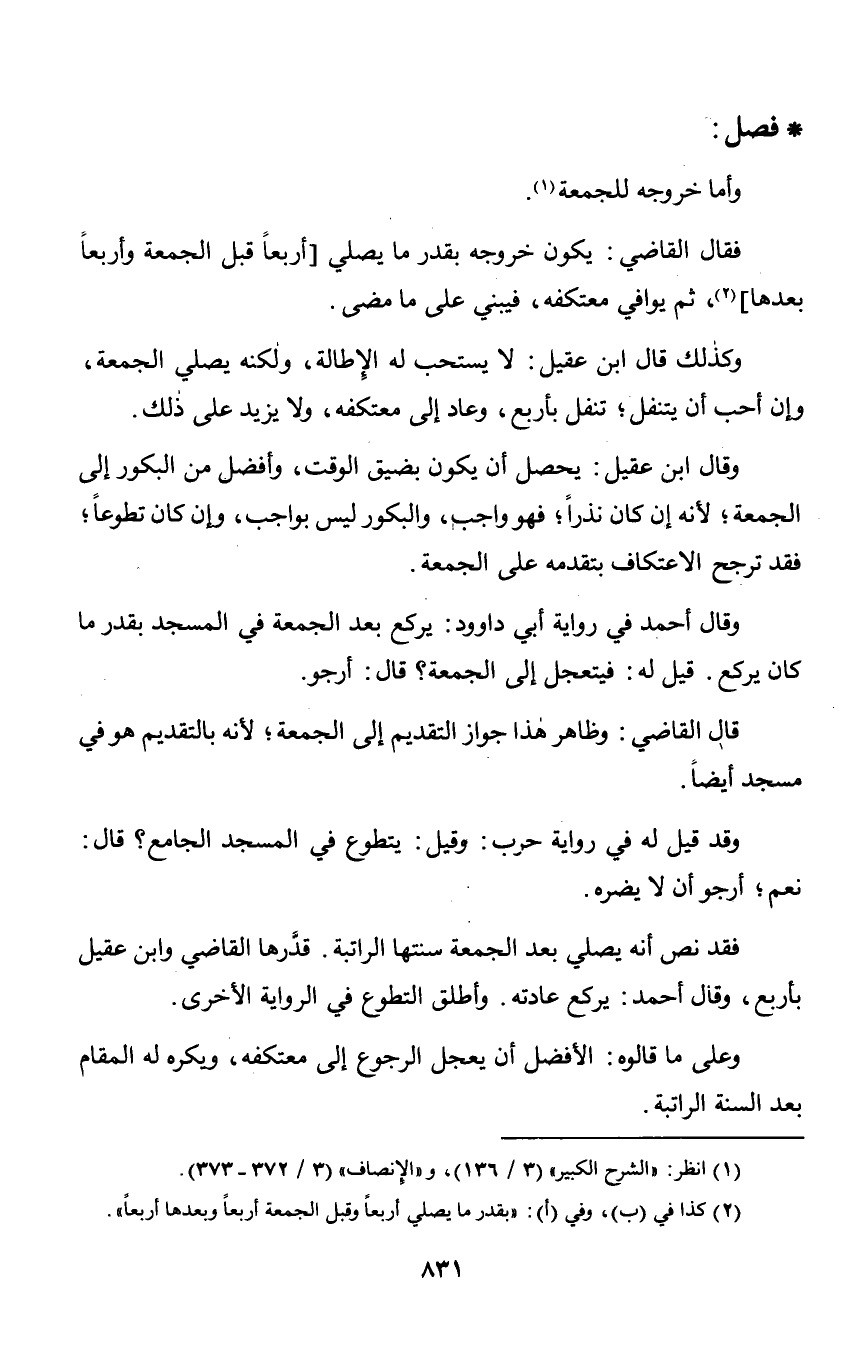 فقال القاضي: يكون خروجه بقدر ما يصلي [أربعاً قبل الجمعة وأربعاً بعدها] , ثم يوافي معتكفه, فيبني على ما مضى.