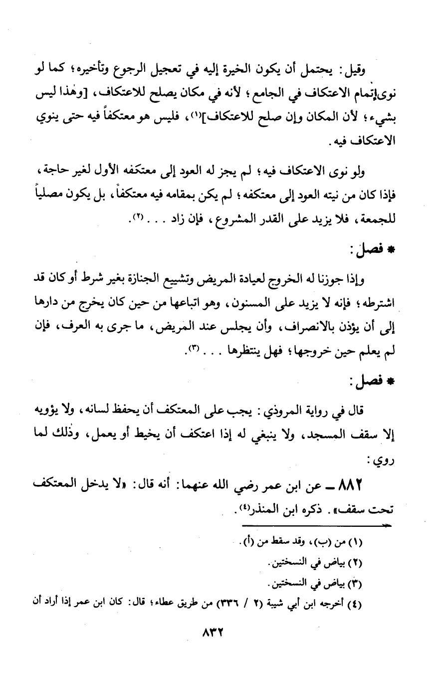 882 - عن ابن عمر رضي الله عنهما: أنه قال: «لا يدخل المعتكف تحت سقف». ذكره ابن المنذر.