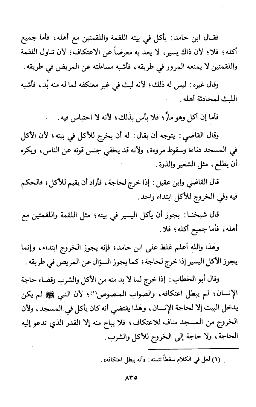وهذا والله أعلم غلط على ابن حامد؛ فإنه يجوز الخروج ابتداء, وإنما يجوز الأكل اليسير إذا خرج لحاجة؛ كما يجوز السؤال عن المريض في طريقه.