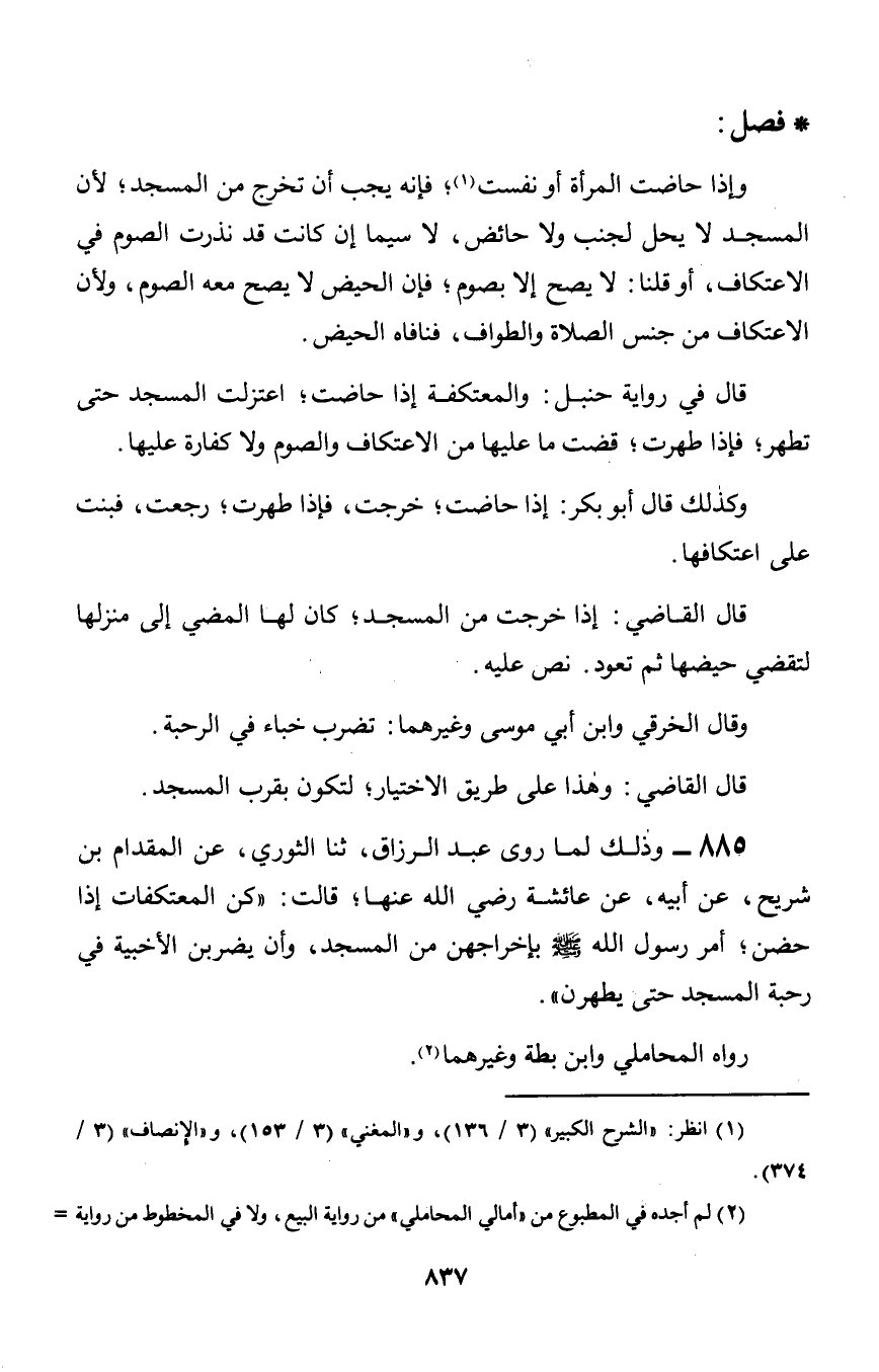 885 - وذلك لما روى عبد الرزاق, ثنا الثوري, عن المقدام بن شريح, عن أبيه, عن عائشة رضي الله عنها؛ قالت: «كن المعتكفات إذا حضن؛ أمر رسول الله صلى الله عليه وسلم بإخراجهم من المسجد, وأن يضربن الأخبية في رحبة المسجد حتى يطهرن».