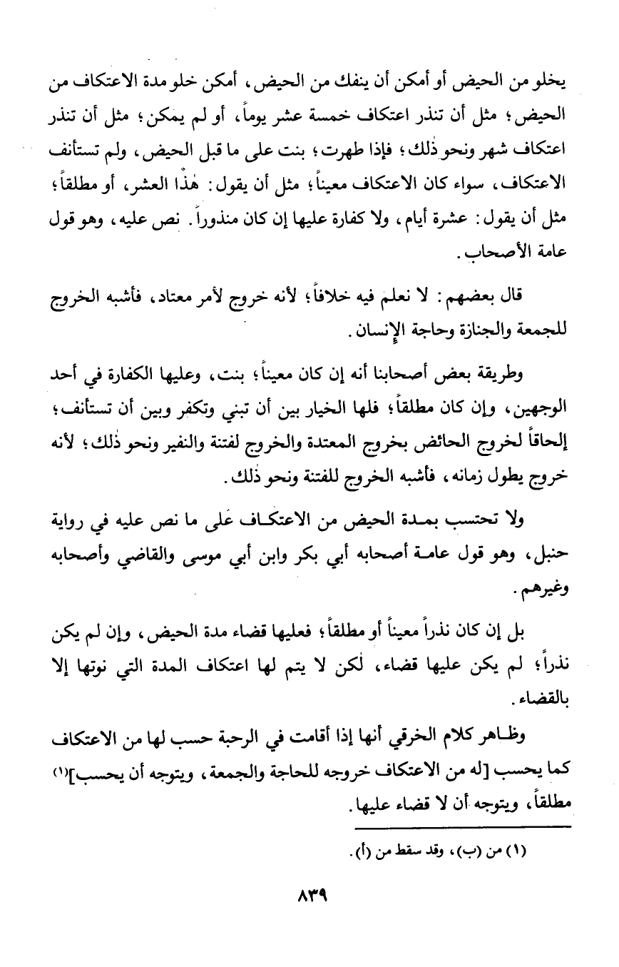 ولا تحتسب بمدة الحيض من الاعتكاف على ما نص عليه في رواية حنبل, وهو قول عامة أصحابه أبي بكر وابن أبي موسى والقاضي وأصحابه وغيرهم.