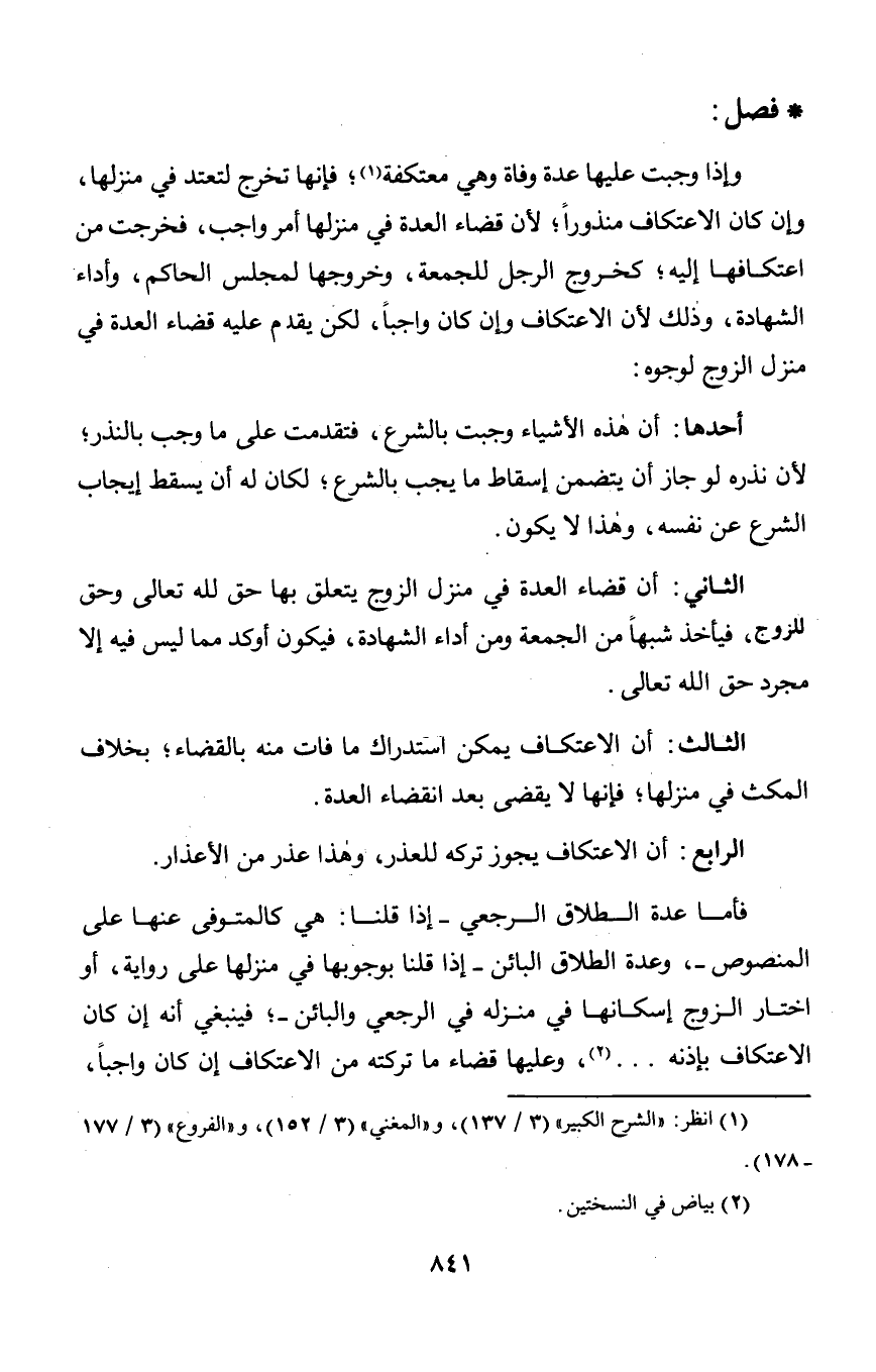 وإذا وجبت عليها عدة وفاة وهي معتكفة؛ فإنها تخرج لتعتد في منزلها, وإن كان الاعتكاف منذوراً؛ لأن قضاء العدة في منزلها أمر واجب, فخرجت من اعتكافها إليه؛ كخروج الرجل للجمعة, وخروجها لمجلس الحاكم, وأداء الشهادة, وذك لأن الاعتكاف وإن كان واجباً, لكن يقدم عليه قضاء العدة في منزل الزوج لوجوه: