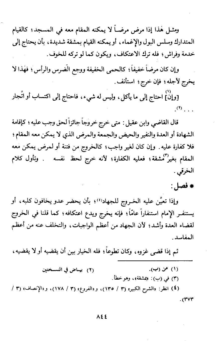 ومثل هذا إذا مرض مرضاً لا يمكنه المقام منه في المسجد؛ كالقيام المتدارك وسلس البول والإِغماء, أو يمكنه القيام بمشقة شديدة, بأن يحتاج إلى خدمة وفراش؛ فله ترك الاعتكاف, ويكون كما لو تركه للخوف.