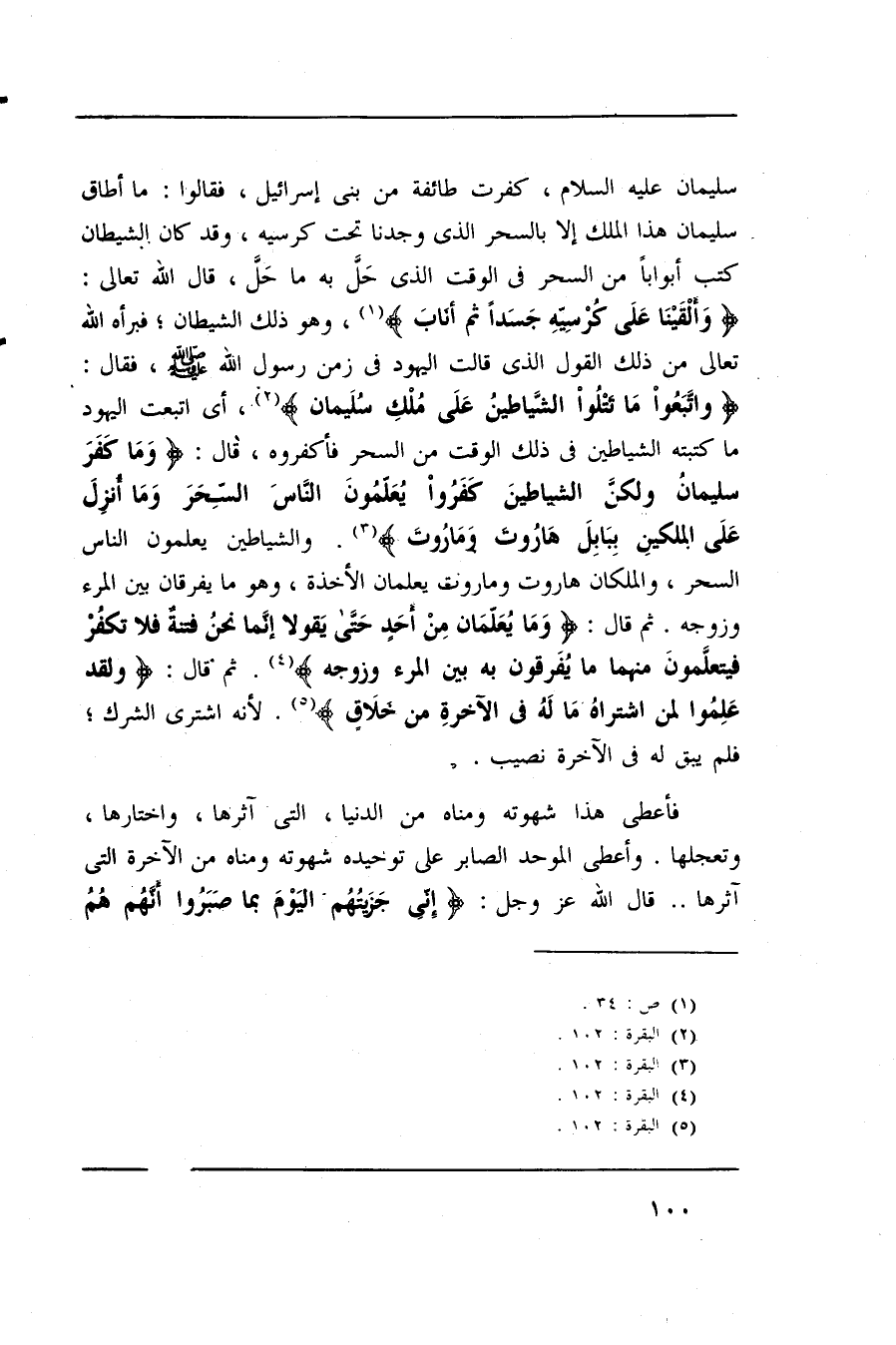سليمان عليه السلام، كفرت طائفة من بنى إسرائيل، فقالوا: ما أطاق سليمان هذا الملك إلا بالسحر الذى وجدنا تحت كرسيه، وقد كان الشيطان كتب أبواباً من السحر في الوقت الذى حل به ما حل، قال الله تعالى: (وَأَلقَينا عَلَى كُرسِيهِ جَسَداً ثُمّ أَنابَ) ، وهو ذلك الشيطان؛ فبرأه الله تعالى من ذلك القول الذى قالت اليهود في زمن رسول الله صلى الله عليه وسلم، فقال: (وَاتَبَعُوا ما تَتلُوا الشَيَاطِينُ عَلَى مُلكِ سُلِيمان) ، أى اتبعت اليهود ما كتبه الشياطين في ذلك الوقت من السحر فأكفروه، قال: (وَمَا كَفَرَ سُلِيمانُ وَلَكِنَّ الشَياطِينَ كَفَرُوا يُعَلِمونَ النَّاسَ السِحرَ وَمَا أُنزِلَ عَلَى المَلَكَينِ بِبَابِلَ هَارُوتَ وَمارُوت) . والشياطين يعلمون الناس السحر، والملكان هاروت وماروت يعلمان الأخذة، وهو ما يفرقان بين المرء وزوجه. ثم قال: (وَما يُعلِمانِ مِن أَحَدِ حَتى يَقُولاَ إِنّما نَحنُ فِتنَةٌ فَلاَ تَكفُر فَيَتَعَلَمُونَ مِنهُما ما يُفَرِقُونَ بِهِ بَينَ المَرءِ وَزَوجِهِ) .ثم قال: (وَلَقَد عَلِموا لَمَن اِشتَرَاهُ مَا لَهُ فِي الأخِرَةِ مِن خَلاق) .لأنه اشترى الشرك؛ فلم يبق له في الآخرة نصيب.