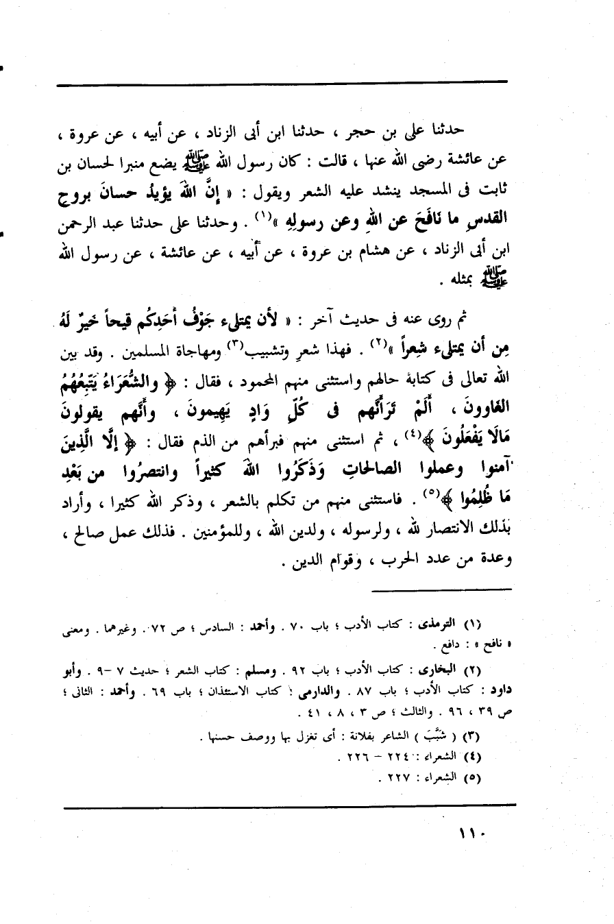 ثم روى عنه في حديث آخر: (لأن يمتلىء جوف أحدكم قيحا خير له من أن يمتلىء شعرا) فهذا شعر وتشبيب ومهاجاة المسلمين. وقد بين الله تعالى في كتابه حالهم واستثنى منهم المحمود، فقال: (وَالشُعَرَاءُ يَتِّبِعُهُمُ الغاوون. أَلَم تَرَ أَنَّهُم في كُلِ وادٍ يَهيمُون. وَأَنَّهُم يَقُولونَ مَالا يَفعَلون) ، ثم استثنى منهم فبرأهم من الذم فقال: (إِلاَّ الَّذِينَ آمَنَوا وَعَمِلوا الصالِحات وَذَكَرُوا اللهَ كَثَيراً وَانتَصَروا مِن بَعدِ ما ظُلِمُوا) . فاستثنى منهم من تكلم بالشعر، وذكر الله كثيرا، وأراد بذلك الإنتصار لله، ولرسوله، ولدين الله، وللمؤمنين. فذلك عمل صالح، وعدة من عدد الحرب، وقوام الدين.