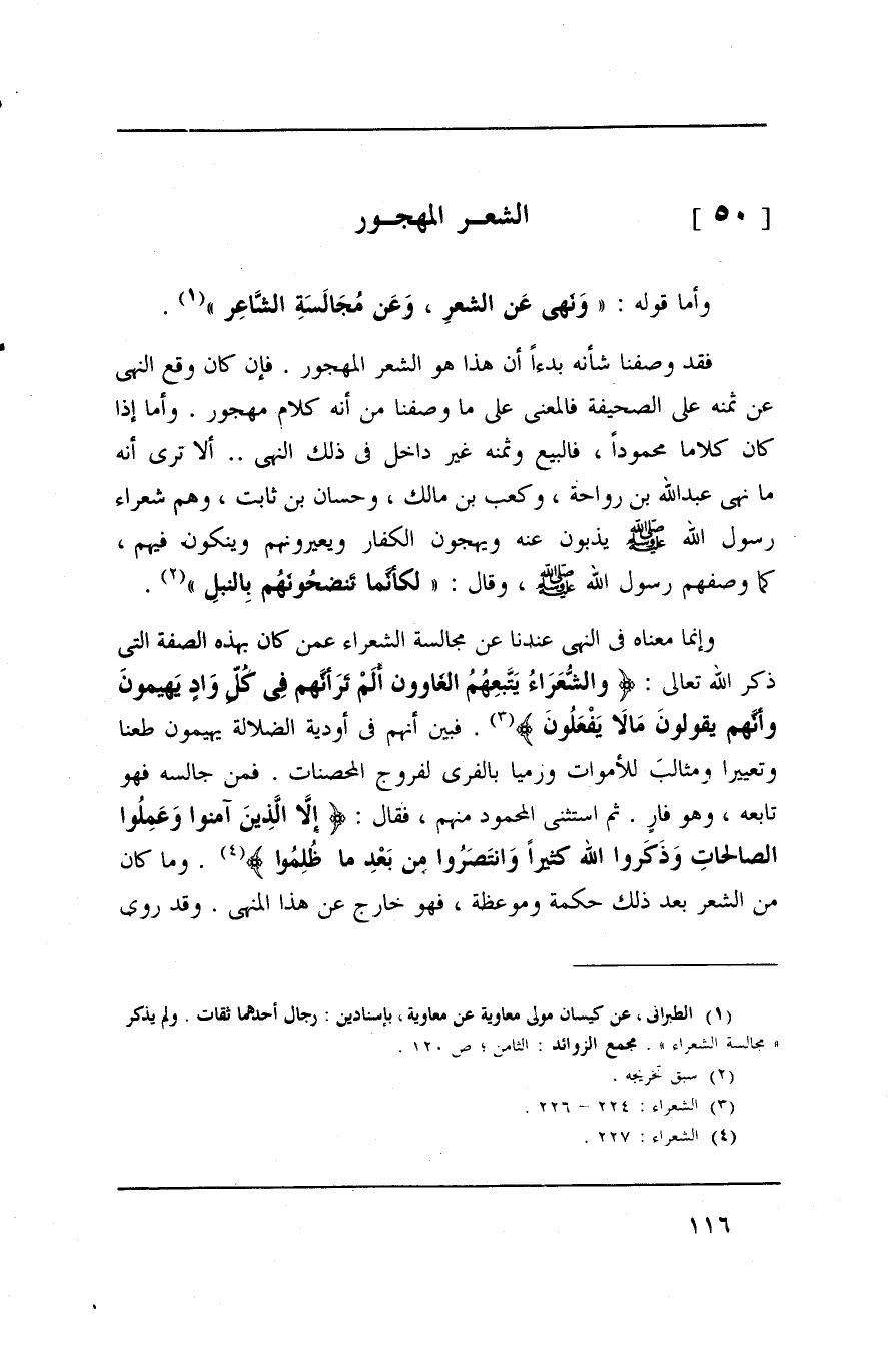 وإنما معناه في النهي عندنا عن مجالسة الشعراء عمن كان بهذه الصفة التي ذكر الله تعالى: (وَالشُعَراءُ يَتَّبِعهُمُ الغَاوون أَلَم تَر أَنَّهُم في كُلِ وَادٍ يَهيمونَ وَأَنَّهُم يَقولونَ مَالاَ يَفعَلُونَ) فبين أنهم في أودية الضلالة يهيمون طعنا وتعييرا ومثالب للأموات ورميا بالفرى لفروج المحصينات. فمن جالسه فهو تابعه، وهو فار. ثم استنثى المحمود منهم، فقال: (إلا الَّذين آَمَنَوا وَعَمِلوا الصالِحات وَذَكَرُوا الله كَثيراً وَانتَصَرُوا مِن بَعدِ ما ظُلِمُوا) . وما كان من الشعر بعد ذلك حكمة وموعظة، فهو خارج عن هذا المنهى، وقد روي