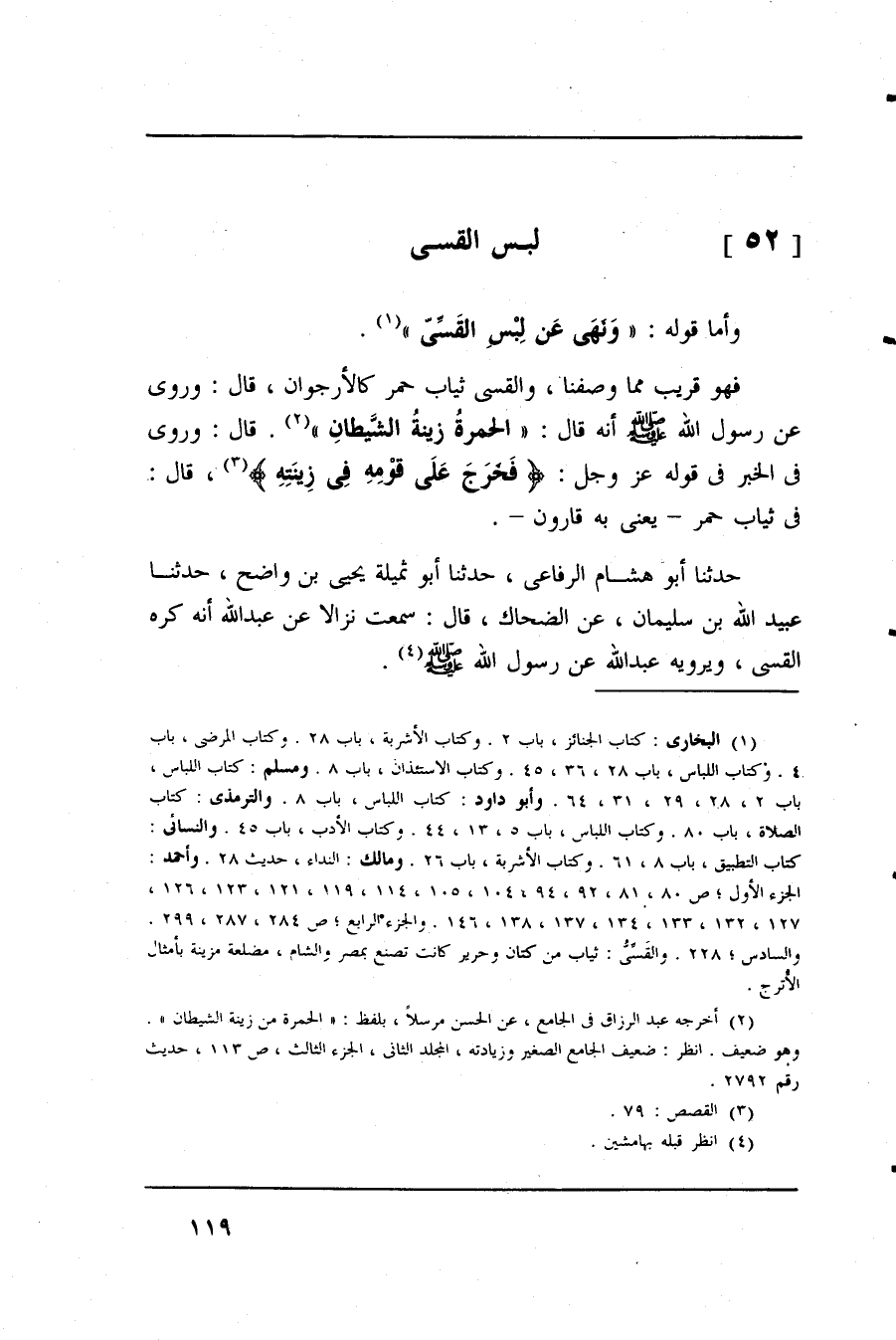 فهو قريب مما وصفنا، القسى ثياب حمر كالأرجوانن قال: وروى عن رسول الله صلى الله عليه وسلم أنه قال: طالحمرة زينة الشيطان " قال: وروى في الخبر في قوله عز وجل: (فَخَرَجَ عَلَى قَومِ فِى زِينَتهِ) قال: في ثياب حمر - يعني به قارون -.