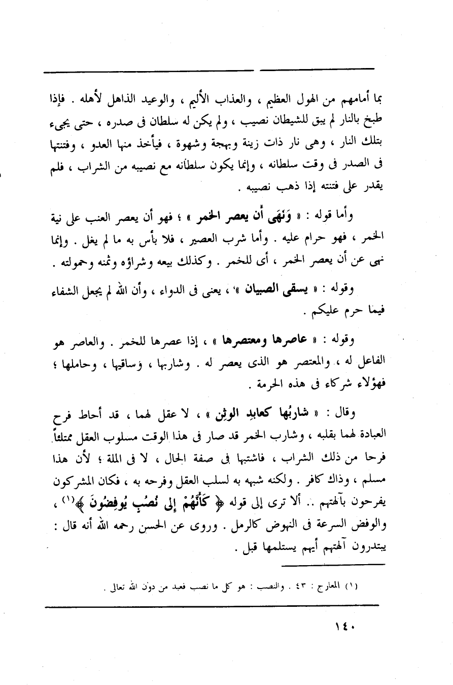 وقال: (شاربُها كعابد الوثن) لا عقل لهما، قد أحاط فرح العباد لهما بقلبه، وشارب الحمر قد صار في هذا الوقت مسلوب العقل ممتلئا فرحا من ذلك الشراب، فاشتبها في صفة الحال، لا في الملة؛ لأن هذا مسلم، وذاك كافر. ولكنه شبهه به لسلب العقل وفرحه به، فكان المشركون يفرحون بآلهتهم.. ألا ترى إلى قوله (كَأَنَّهُم إٍلى نُصُبٍ يُوفِضُونَ) ، والوفض السرعة في النهوض كالرمل. وروى عن الحسن رحمه الله أنه قال: يبتدرون آلهتهم أيهم يستلمها قبل.