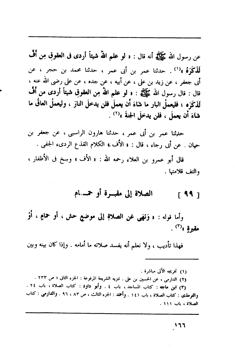 عن رسول الله صلى الله عليه وسلم أنه قال: (لو علم الله شيئا أردة في العقوق من أف لذكره) حدثنا عمر بن أبي عمر، حدثنا محمد بن حجر، عن أبي جعفر، عن زيد بن علي، عن أبيه عن جده، عن علي رضي الله عنه، قال: قال رسول الله صلى الله عليه وصسلم: (لو علم الله من العقوق شيئا أردة من أف لذكره؛ فليعمل البار ما شاء أن يعمل فلن يدخل النار، وليعمل العاق ما شاء أن يعمل، فلن يدخل الجنة) .