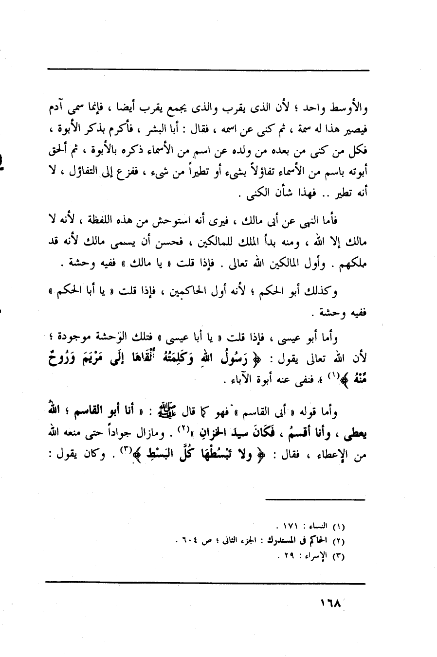 والأوسط واحد؛ لأن الذي يقرب والذي يجمع يقرب أيضا، فإنما سمي آدم فيصير هذا له سمة، ثم كنى عن اسمه، فقال: أبا البشر، فأكرم بذكر الأبوة، فكل من كنى من بعده من ولده عن إسم من الأسماء بالأبوة، ثم ألحق أبوته باسم من الأسماء تفاؤلا بشيء أو تطيرا من شيء، ففزع إلى التفاؤل، لا أنه تطير.. فهذا شأن الكنى.