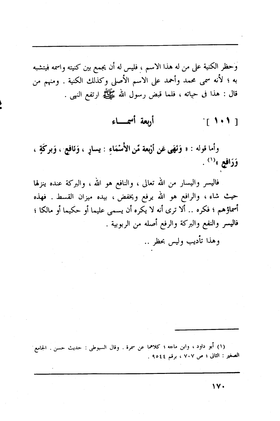 وأما قوله: (ونهى عن أربعة من الأسماء: يسار، ونافع، وبركة، ورافع) .
