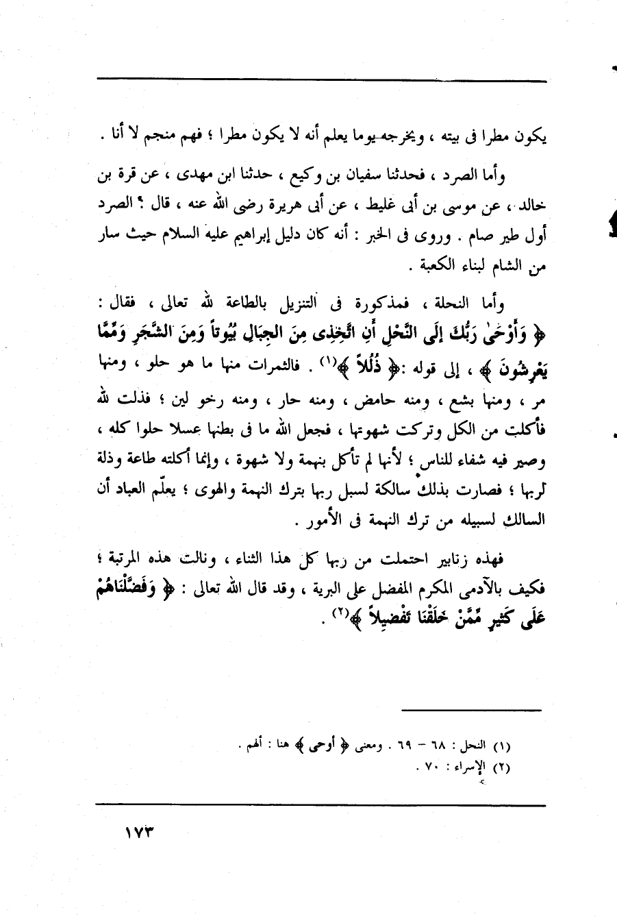 وأما النحلة، فمذكورة في التنزيل بالطاعة لله تعالى، فقال: (وَأَوحَى رَبُّكَ إِلَى النَّحلِ أَنِ اتَّخِذي مِنَ الجِبالِ بُيُوتاً وَمِنَ الشَّجَرِ وَمِمَّا يَعرِشُونَ) إلى قوله: (ذُلُلاً) فالثمرات منها ما هو حلو، ومنها مر، ومنها بشع، ومنه حامض، ومنه حار، ومنه رخو لين؛ فذلت لله فأكلت من الكل وتركت شهوتها، فجعل الله ما في بطنها عسلا حلوا كله، وصير فيه شفاء للناس؛ لأنها لم تأكل بنهمة ولا شهوة، وإنما أكلته طاعة وذلة لربها؛ فصارت بذلك سالكة لسبل ربها بترك النهمة والهوى؛ يعلم العباد أن السالك لسبيله من ترك النهمة في الأمور.