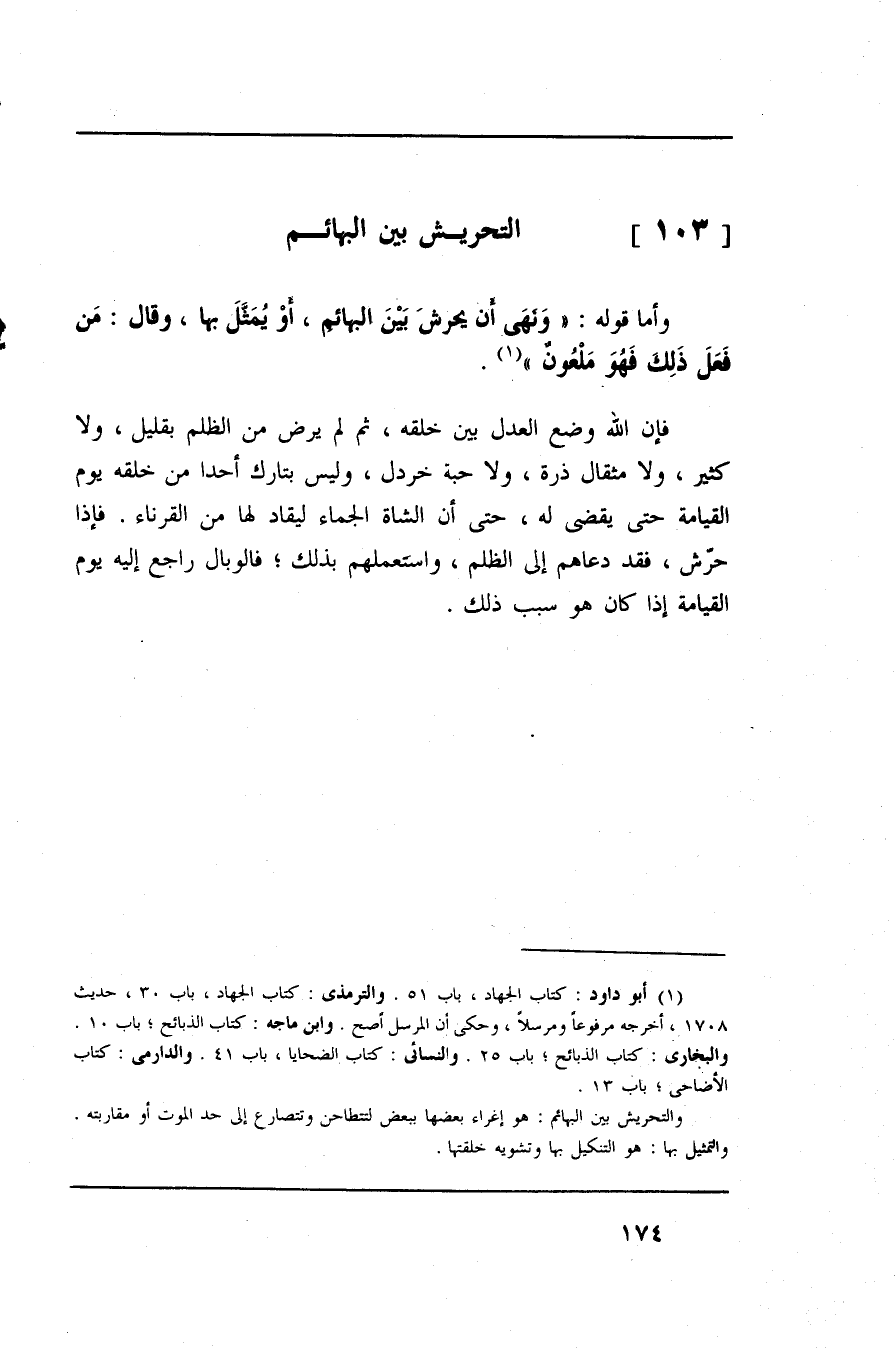 وأما قوله: (ونهى أن يحرش بين البهائم، أو يمثل بها، وقالك من فعل ذلك فهو ملعون) .