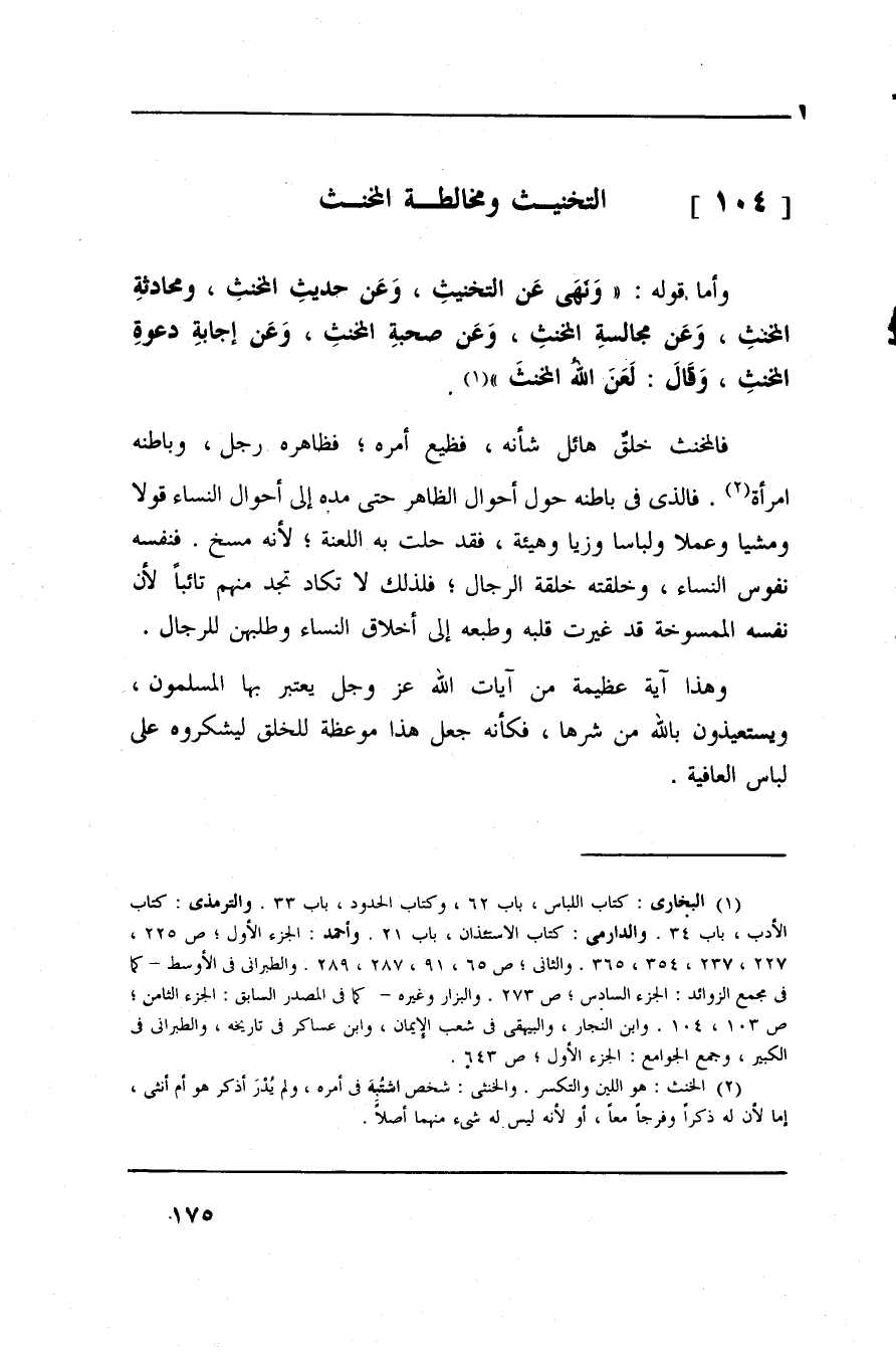 وأما قوله: (ونهى عن التخنيث، وعن حديث المخنث، ومحادثة المخنث، وعن مجالسة المخنث، وعن صحبة المخنث، وعن إجابة دعوة المخنث، وقال: لعن الله المخنث) .