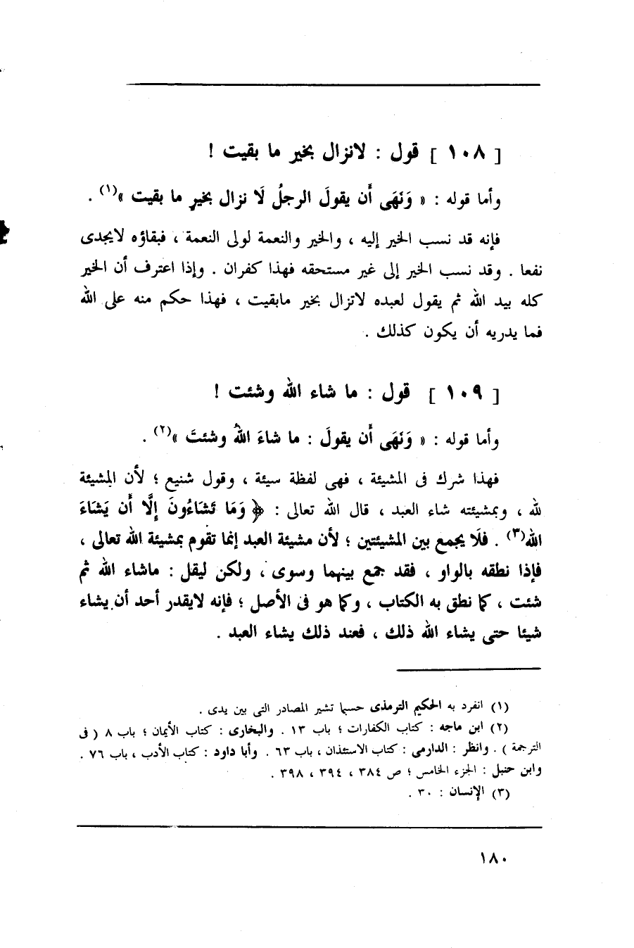 فهذا شرك في المشيئة، فهي لفظة سيئةن وقول شينع؛ لأن المشيئة لله، وبمشيئته شاء العبد، قال الله تعالى: (وَما تَشاءُونَ إِلاَّ أَن يَشاءَ الله. فلا يجمع بين المشيئتين؛ لأن مشيئة العبد إنما تقوم بمشيئة الله تعالى، فإذا نطقه بالواو، فقد جمع بينهما وسوى، ولكن ليقل: ما شاء الله ثم شئت، كما نطق به الكتاب، وكما هو في الأصل؛ فإنه لا يقدر أحد أن يشاء شيئا حتى يشاء الله ذلك، فعند ذلك يشاء العبد.