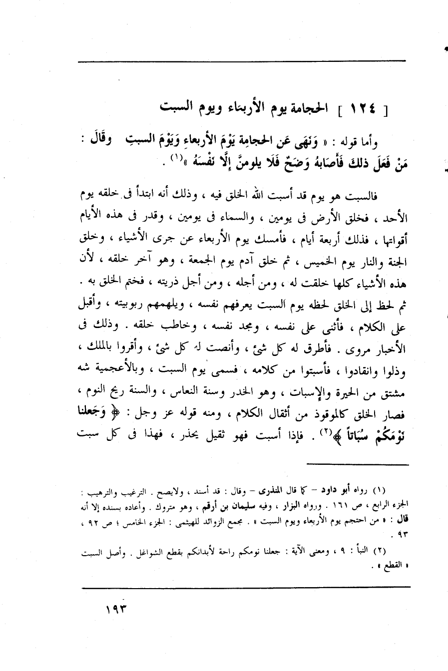 ثم لحظ إلىالخلق لحظة يوم السبت يعرفهم نفسه، ويلهمهم ربوبيته، وأقبل على الكلام، فأثنى على نفسه، ومجد نفسه، وخاطب خلقه. وذلك في الأخبار مروي. فأطرق له كل شيء وأنصت له كل شيء، وأقروا بالملك، وذلوا وانقادوان فاسبتوا من كلامه، فسمى يوم السبت، وبالأعجمية شه مشتق من الحيرة والإسبات، وهو الخدر وسنة النعاس، والسنة ريح النوم، فصار الخلق كالموقوذ من أثقال الكلام، ومنه قوله عز وجل: (وجَعلنا نومَكُم سُباتا) فإذا أسبت فهو ثقيل يحذر، فهذا في كل سبت