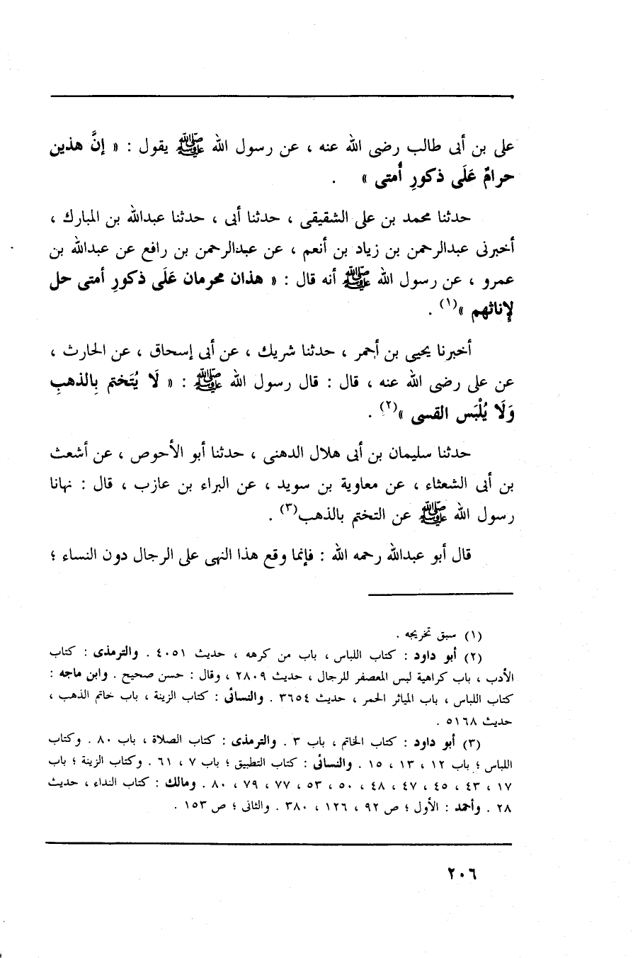 علي بن أبي طالب رضي الله عنه، عن رسول الله صلى الله عليه وسلم يقول: (إنَّ هذين حرام على ذكور أمتي) .