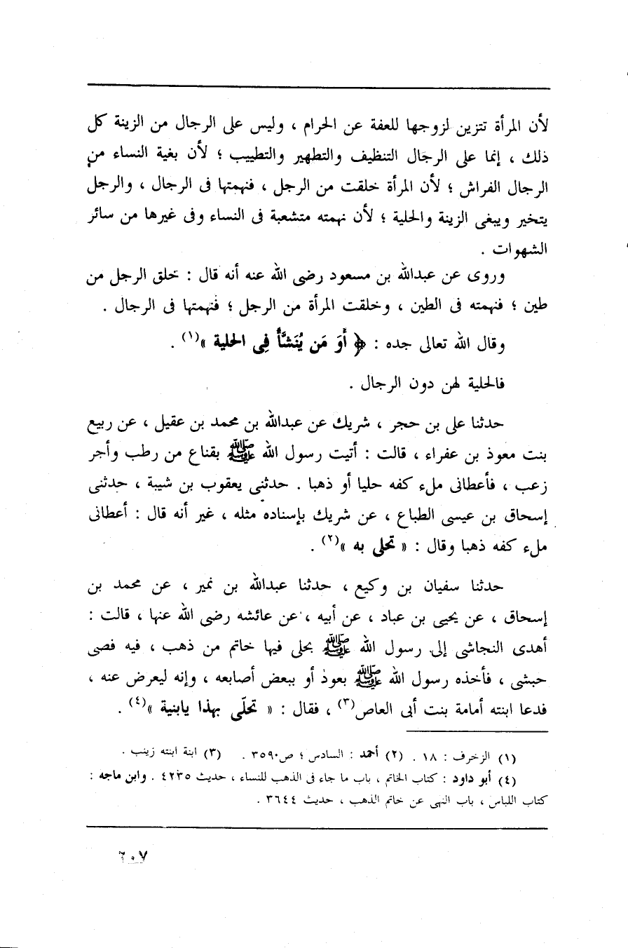 لأن المرأة تتزين لزوجها للعفة عن الحرام، وليس على الرجال من الزينة كل ذلك، إنما على الرجال التنظيف والتطهير والتطييب؛ لأن بغية النساء من الرجال الفراش، لأن المرأة خلقت من الرجل، فنهمتها في الرجال، والرجل يتخير ويبغي الزينة والحلية؛ لأن نهمته متشعبة في النساء وفي غيرها من سائر الشهوات (.