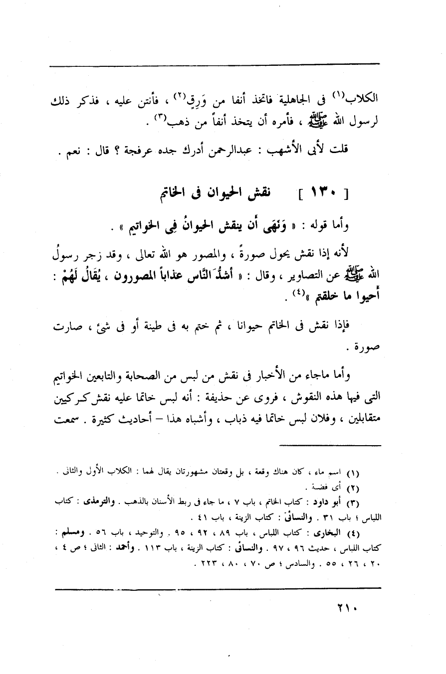 وأما ما جاء من الأخبار في نفس من لبس من الصحابة والتابعين الخواتيم التي فيها هذه النقوش، فروى عن حذيفة: أنه لبس خاتما عليه نقش كركيين متقابلين، وفلان لبس خاتما فيه ذباب، وأشباه هذا - أحاديث كثيرة. سمعت