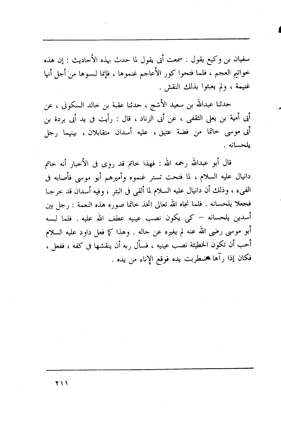حدثنا عبد الله بن سعيد الأشج، حدثنا عقبة بن خالد السكوني، عن أبي أمية بن يعلى الثقفي، عن أبي الزناد، قال: رأيت في يد أبي بردة بن أبي موسى خاتما من فضة عتيق، عليه أسدان متقابلان، بينهما رجل يلحسانه.
