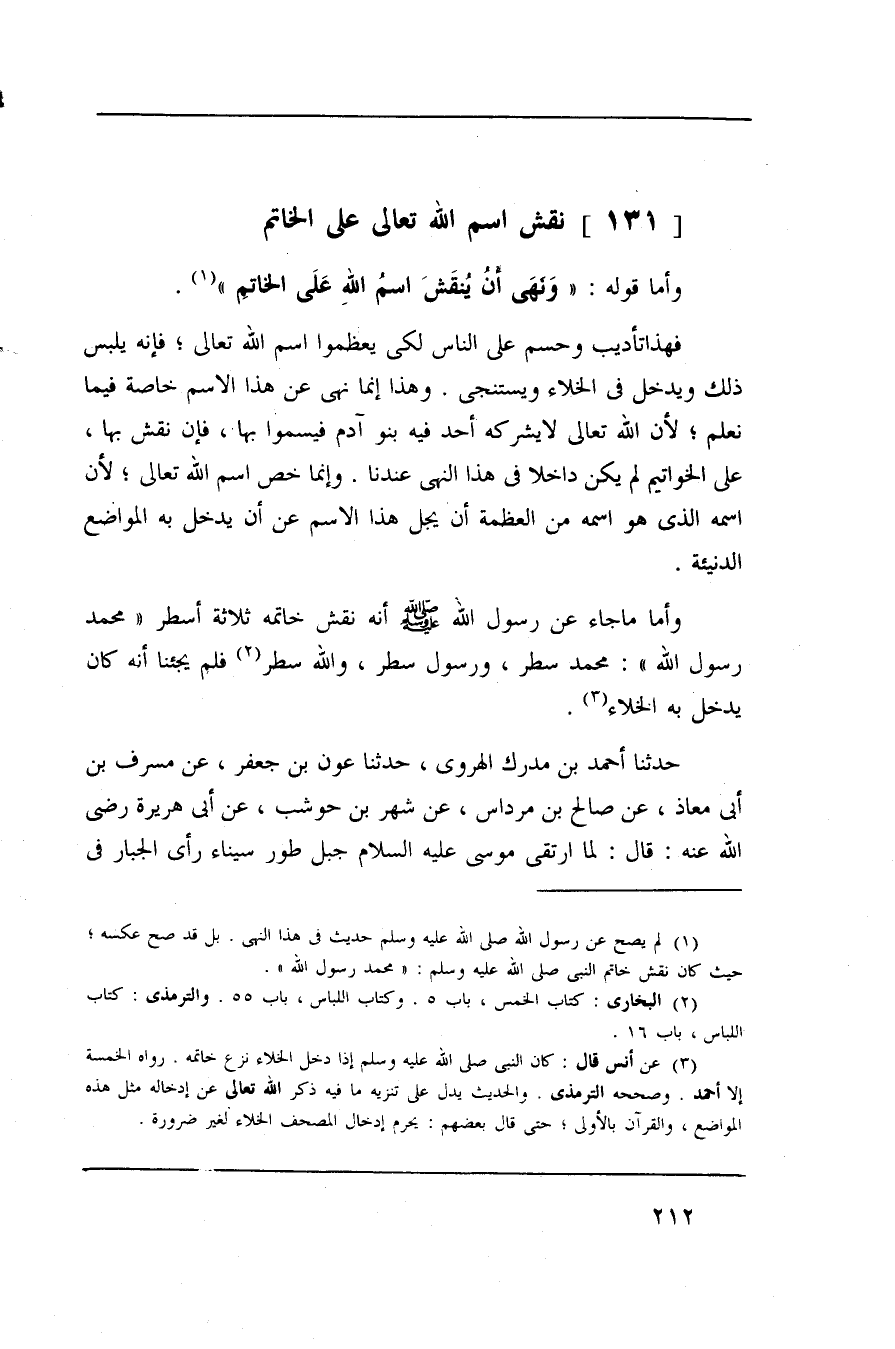 وأما ما جاء عن رسول الله صلى الله عليه وسلم أنه نقش خاتمه ثلاثة أسطر " محمد رسول الله الله ": محمد سطر، ورسول سطر، والله سطر، فلم يجئنا أنه كان يدخل به الخلاء.