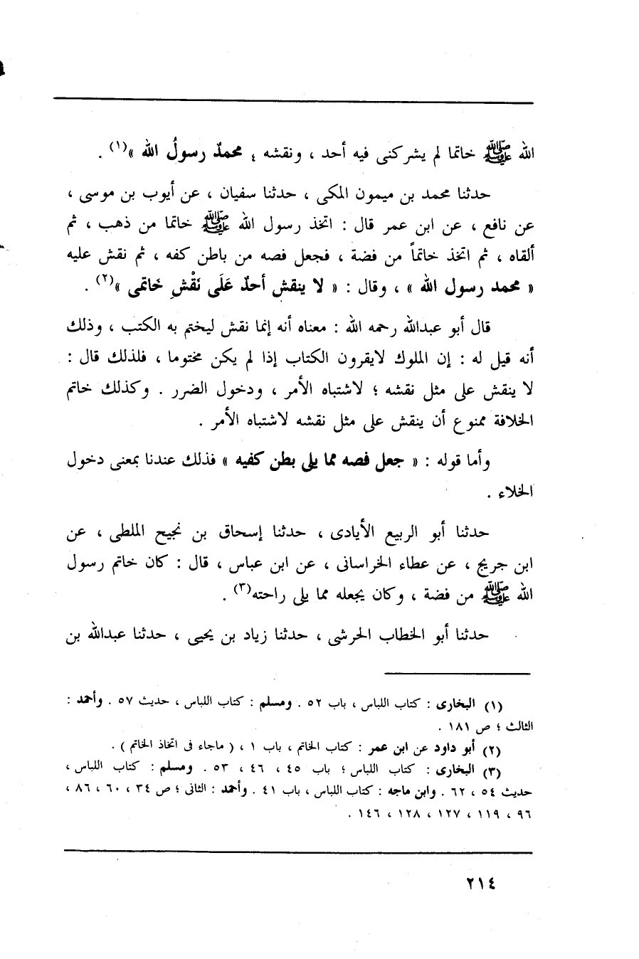 حدثنا محمد بن ميمون المكي، حدثنا سفيان، عن أيوب بن موسى، عن نافع، عن ابن عمر قال: اتخذ رسول الله صلى الله عليه وسلم خاتما من ذهب، ثم ألقاه، ثم اتخذ خاتما فضة، فجعل فصه من باطن كفه، ثم نقش عليه " محمد رسول الله " وقال: (لا ينقش أحد على نقش خاتميْ) .قال أبو عبد الله رحمه الله: معناه أنه إنما نقش ليختم به الكتب، وذلك أنه قيل له: إن الملوك لا يقرون الكتاب إذا لم يكن مختوما، فلذلك قال: لا ينقش على مثل نقشه؛ لاشتباه الأمر، ودخول الضرر. وكذلك خاتم الخلافة ممنوع أن نقشه على مثل نقشه لاشتباه الأمر.