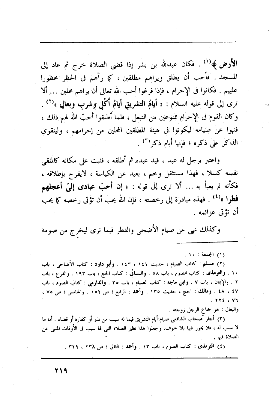 الأَرضِ (فكان عبد الله من بشر إذا قضى الصلاة خرج ثم عاد إلى المسجد، فأحب أن يطلق ويراهم مطلقتين، كما رآهم في الحظر محظورا عليهم. فكانوا في الإحرام، فإذا فرغوا أحب الله الله تعالى أن يراهم محلين ... ألا ترى إلى قوله عليه السلام:) أيام التشريق أيام أكل وشرب وبعالْ (. وكان القوم في الإحرام ممنوعين من التبعل، فلما أطلقوا أحب الله لهم ذلك، فنهوا عن صيامه ليكونوا في هيئة المطلقين المحلين من إحرامهم، وليتقوى الذاكر على ذكره؛ فإنها أيام ذكر.