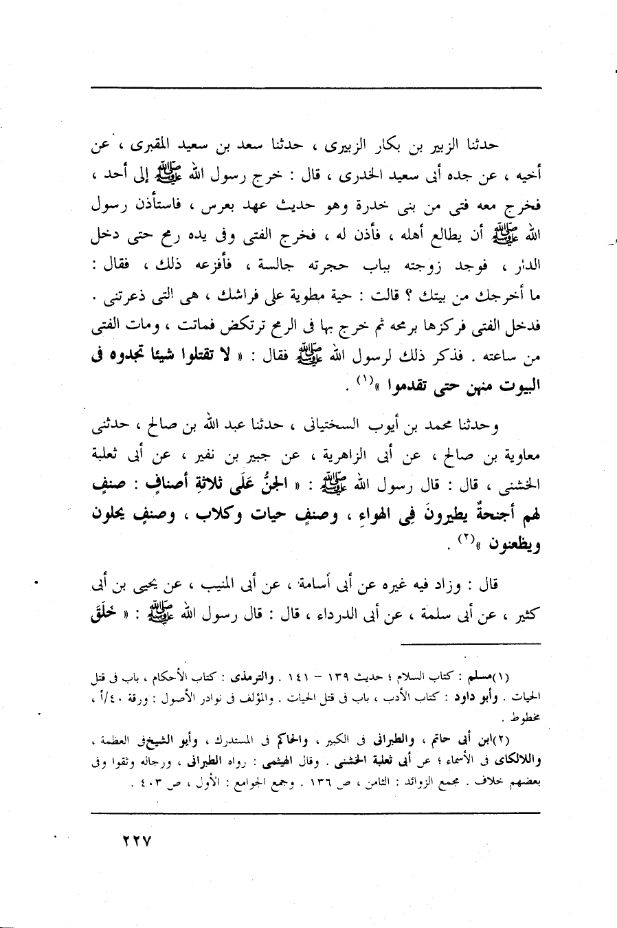 وحدثنا محمد بن أيوب السختياني، حدثنا عبد الله بن صالح، حدثني معاوية بن صالح، عن أبي الزاهرية، عن جبير بن نفير، عن أبي ثعلبة الخشني، قال: قال رسول الله صلىالله عليه وسلم: (الجن على ثلاثة أصناف: صنف لهم أجنحة يطيرون في الهواء، وصنف حيات وكلاب، وصنف يحلون ويظعنون) .
