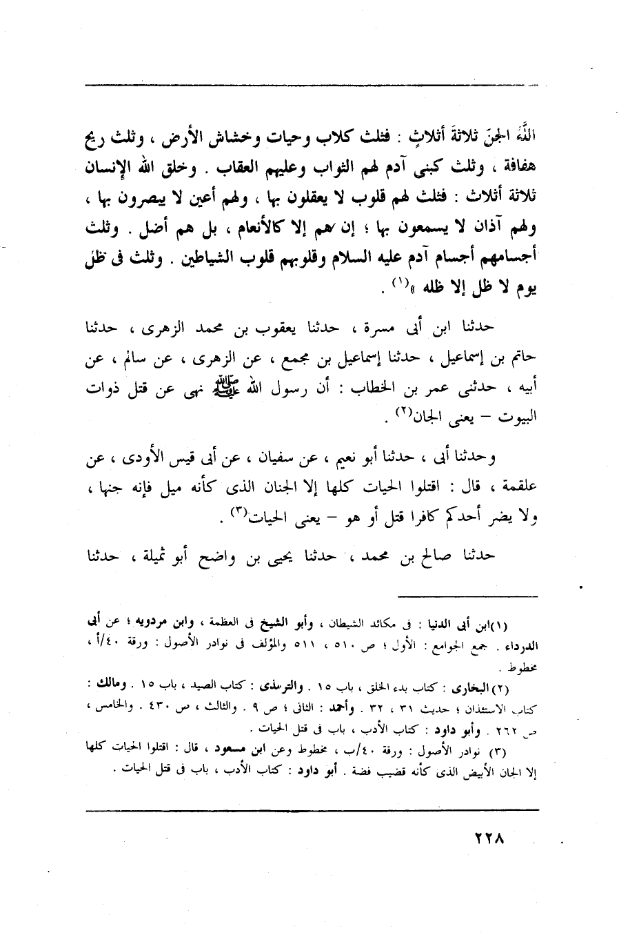 وحدثنا أبي، حدثنا أبو نعيم، عن سفيان، عن أبي قيس الأودي، عن علقمة، قالك اقتلوا الحيا كلها إلا الجنان الذي كأنه ميل فإنه جنها، ولا يضر أحدكم كافرا قتل أو هو - يعني الحيات) .