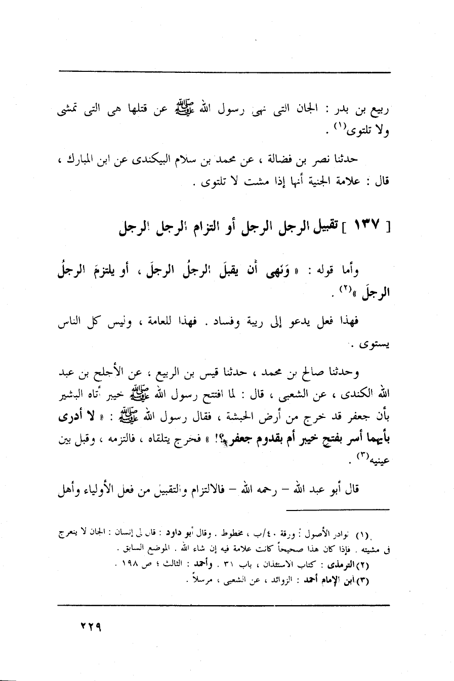 وحدثنا صالح بن محمد، حدثنا قبيس بن الربيع، عن الأجلح بن عبد الله الكندي، عن الشعبي، قال: لما افتتح رسول الله صلى الله عليه وسلم خيبر أتاه البشير بأن جعفر قد خرج من أرض الحبشة، فقال رسول الله صلى الله عليه وسلم:) لا أدري بأيهما أسر بفتح خيبر أم بقدوم جعفر (فخرج يتلقاه، فالتزمه، وقبل بين عينيه.