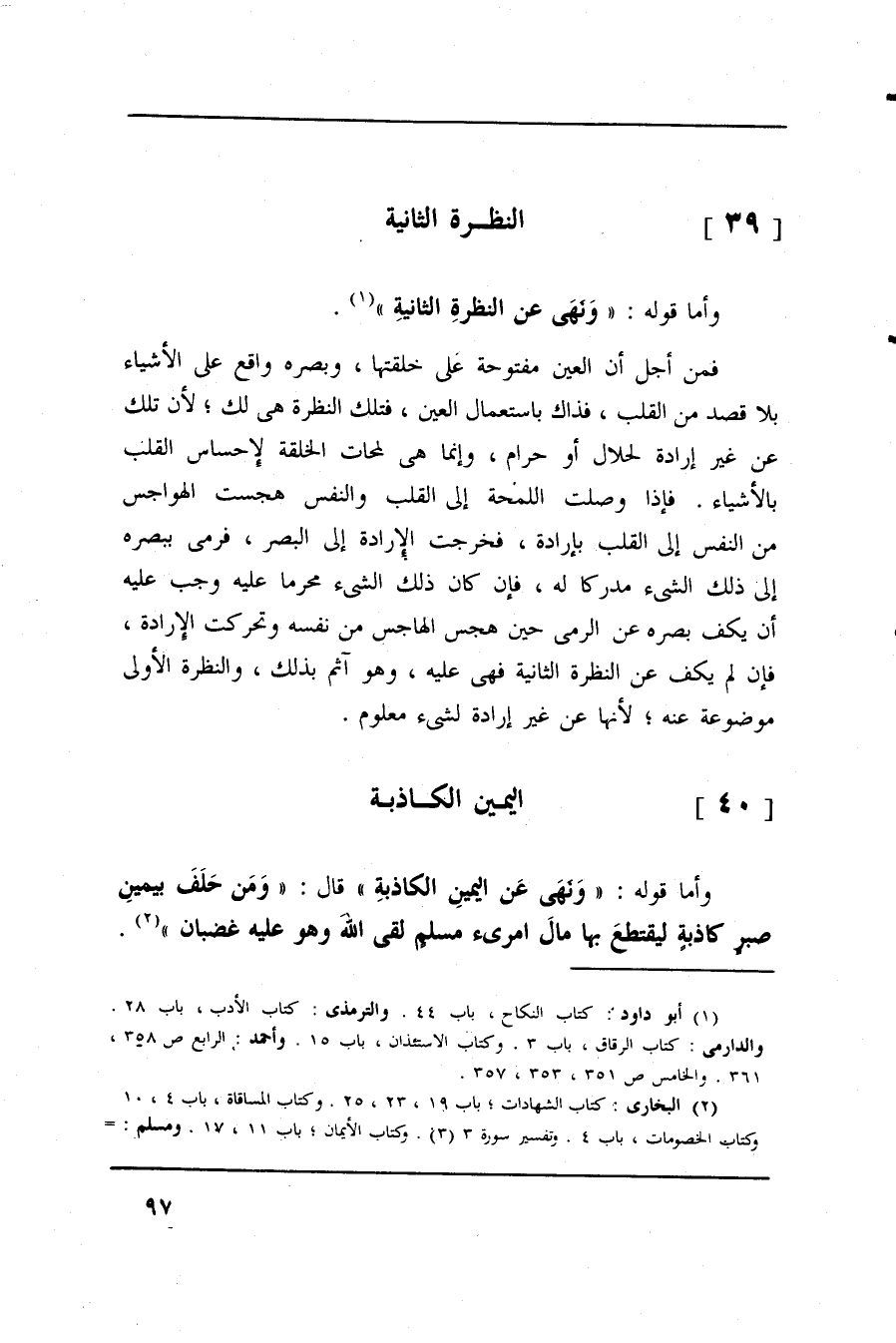 فمن أجل أن العين مفتوحة على خلقتها، وبصره واقع على الأشياء بلا قصد من القلب، فذاك باستعمال العين، فتلك النظرة هى لك؛ لأن تلك عن غير إرادة لحلال أو حرام، وإنما هى لمحات الخلقة لإحساس القلب بالأشياء. فإذا وصلت اللمحة إلى القلب والنفس هجست الهواجس من النفس إلى القلب بإرادة، فخرجت الإرادة إلى البصر، فرمى ببصره إلى ذلك الشيء مدركا له، فإن كان ذلك الشيء محرما عليه وجب عليه أن يكف بصره عن الرمى حين هجس الهاجس من نفسه وتحركت الإرادة، فإن لم يكف عن النظرة الثانية فهى عليه، وهو آثم بذلك، والنظرة الأولى موضوعة عنه؛ لأنها عن غير إرادة لشيء معلوم.