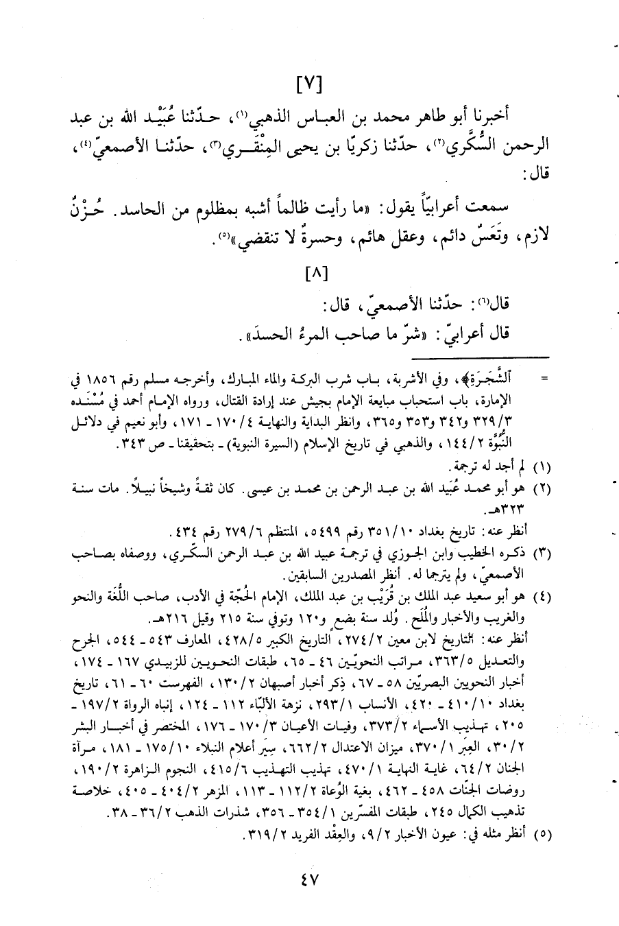 7 - أخبرنَا أَبُو طَاهِر مُحَمَّد بن الْعَبَّاس الذَّهَبِيّ حَدثنَا عبيد الله بن عبد الرَّحْمَن السكرِي حَدثنَا زَكَرِيَّا بن يحي الْمنْقري حَدثنَا الْأَصْمَعِي قَالَ