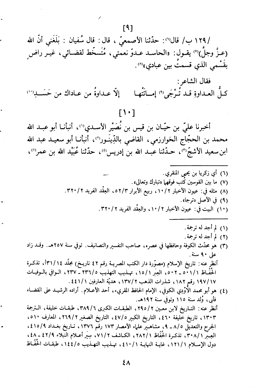 9129 - 129 ب قَالَ حَدثنَا الْأَصْمَعِي قَالَ قَالَ سُفْيَان بلغي أَن الله عز وَجل يَقُول الْحَاسِد عَدو نعمتي متسخط لقضائي غير رَاض بقسمي الَّذِي قسمت بَين عبَادي فَقَالَ الشَّاعِر ... كل الْعَدَاوَة قد ترجى إماتتها ... إِلَّا عَدَاوَة من عاداك من حسد ...