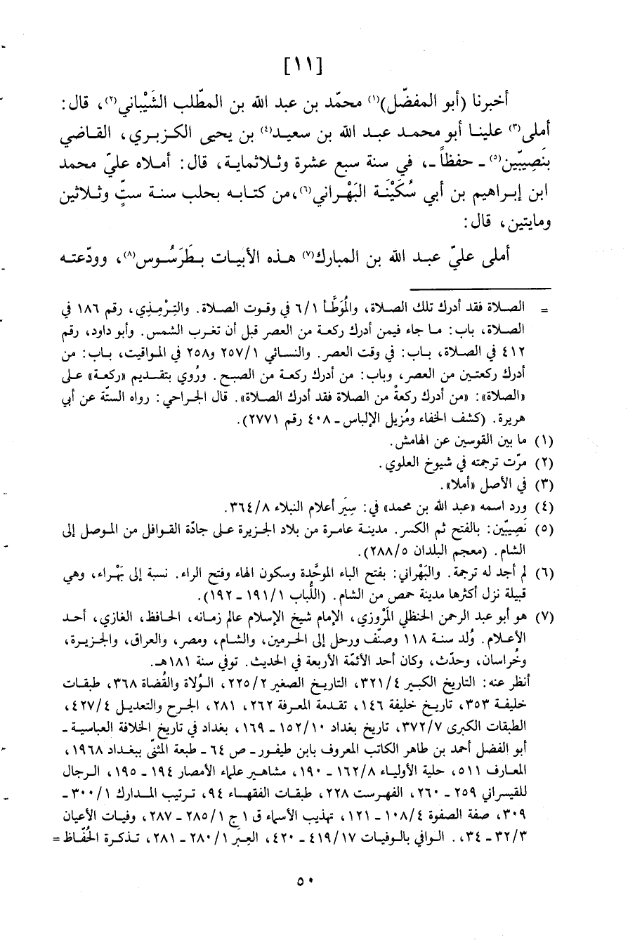 11 - أخبرنَا أَبُو الْمفضل مُحَمَّد بن عبد الله بن الْمطلب الشَّيْبَانِيّ قَالَ أمْلى علينا أَبُو مُحَمَّد عبد الله بن سعيد بن يحي الكزبري القَاضِي بنصيبين حفظا فِي سنة سبع عشرَة وثلاثماية قَالَ أملاه عَليّ مُحَمَّد ابْن إِبْرَاهِيم بن أبي سكينَة البهراني من كِتَابه بحلب سنة سِتّ وَثَلَاثِينَ ومايتين قَالَ