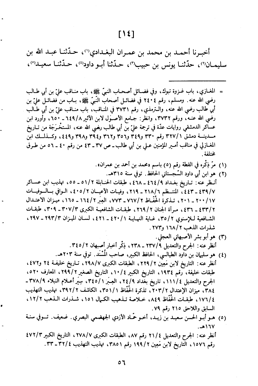 14 - أخبرنَا أَحْمد بن مُحَمَّد بن عمرَان الْبَغْدَادِيّ حَدثنَا عبد الله بن سُلَيْمَان حَدثنَا يُونُس بن حبيب حَدثنَا أَبُو دَاوُد حَدثنَا سعيد 131 أعن عَليّ بن زيد عَن سعيد بن الْمسيب عَن سعيد قَالَ