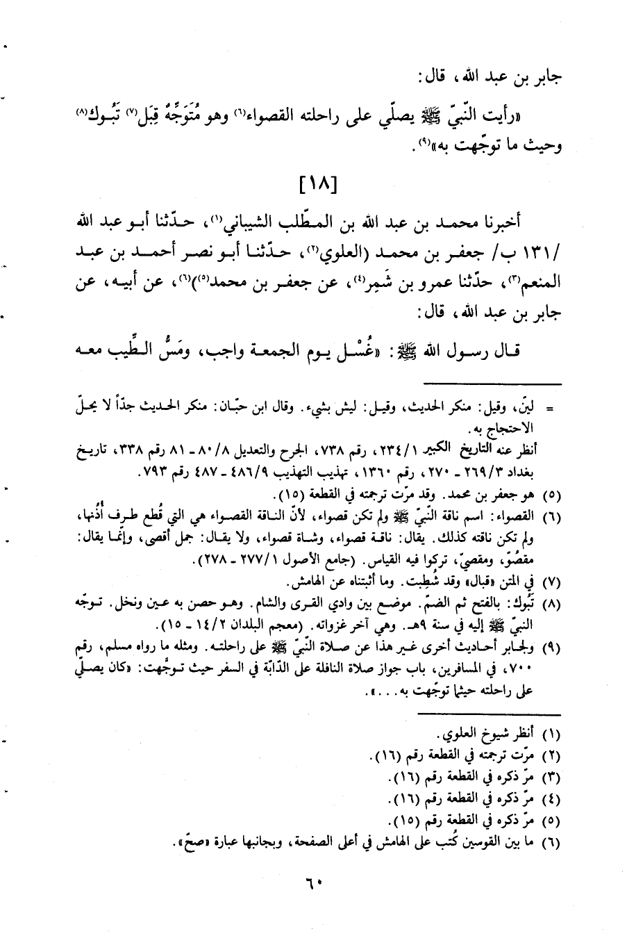 18 - أخبرنَا مُحَمَّد بن عبد الله بن الْمطلب الشَّيْبَانِيّ حَدثنَا أَبُو عبد الله 131 ب جَعْفَر بن مُحَمَّد الْعلوِي حَدثنَا أَبُو نصر أَحْمد بن عبد الْمُنعم حَدثنَا عَمْرو بن شمر عَن جَعْفَر بن مُحَمَّد عَن أَبِيه عَن جَابر بن عبد الله قَالَ قَالَ رَسُول الله صلى الله عَلَيْهِ وَسلم غسل يَوْم الْجُمُعَة وَاجِب وَمَسّ الطّيب مَعَه حسن وَلَقَد كُنَّا نَشُمُّ من رَسُول الله صلى الله عَلَيْهِ وَسلم أطيب الطّيب من غير أَن يكون صنع لَهُ