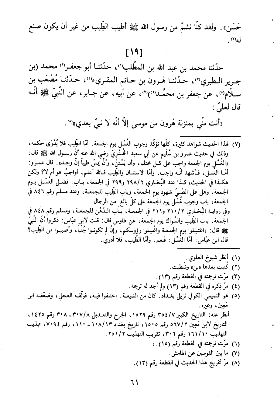 19 - حَدثنَا مُحَمَّد بن عبد الله بن الْمطلب حَدثنَا أَبُو جَعْفَر مُحَمَّد بن جرير الطَّبَرِيّ حَدثنَا هرون بن حَاتِم المقريء حَدثنَا مُصعب بن سَلام عَن جَعْفَر بن مُحَمَّد عَن أَبِيه عَن جَابر عَن النَّبِي صلى الله عَلَيْهِ وَسلم أَنه قَالَ لعَلي أَنْت