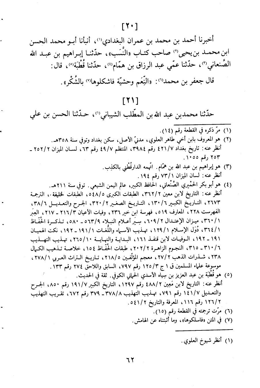 20 - أخبرنَا أَحْمد بن مُحَمَّد بن عمرَان الْبَغْدَادِيّ أَنبأَنَا أَبُو مُحَمَّد الْحسن ابْن مُحَمَّد بن يحي صَاحب كتاب النّسَب حَدثنَا إِبْرَاهِيم بن عبد الله الصَّنْعَانِيّ حَدثنَا عمي عبد الرَّزَّاق بن همام حَدثنَا قُطْبَة قَالَ