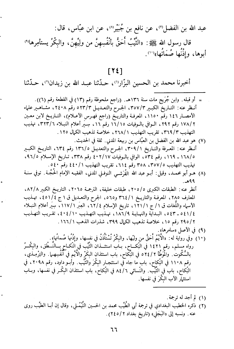 24 - أخبرنَا مُحَمَّد بن الْحُسَيْن الْبَزَّار حَدثنَا عبد الله بن زَيْدَانَ حَدثنَا هناد بن السّري حَدثنَا عِيسَى بن يُونُس عَن عبيد الله بن عبد الرَّحْمَن ابْن موهب حَدثنَا نَافِع بن جُبَير بن مطعم عَن ابْن عَبَّاس قَالَ