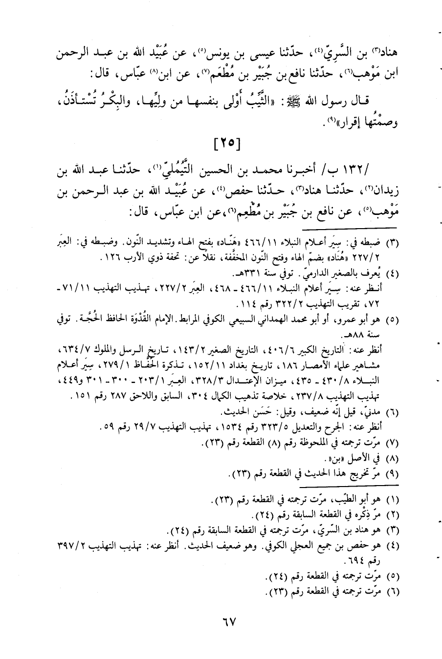 25132 - 132 ب أخبرنَا مُحَمَّد بن الْحُسَيْن التيملي حَدثنَا عبد الله بن زَيْدَانَ حَدثنَا هناد حَدثنَا حَفْص عَن عبيد الله بن عبد الرَّحْمَن بن موهب عَن نَافِع بن جُبَير بن مطعم عَن ابْن عَبَّاس قَالَ